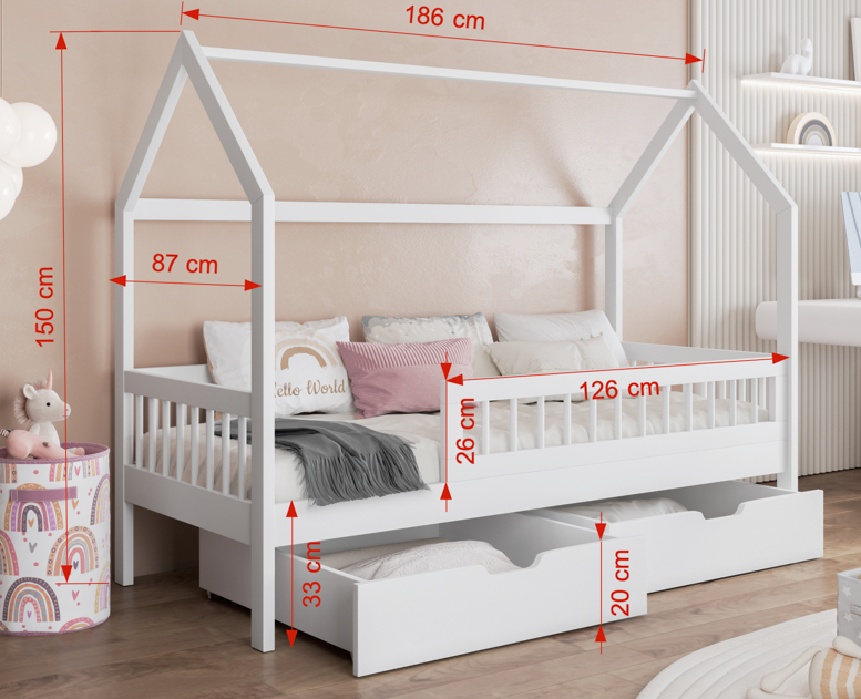 Tο εξωτερικό μέγεθος κρεβατιού, 209 cm στο μήκος και 149 cm στο πλάτος. Στη φωτογραφία του προϊόντος, υπάρχει ένα στρώμα πάχους 10 εκ. Το μοντέλο Pioli στο υψηλότερο σημείο είναι 164,5 εκ. Το στρώμα χωράει στο πλαίσιο του κρεβατιού κατά περίπου 3 εκ. Με στρώμα κρεβατιού πάχους 15 εκ. το παιδί κοιμάται σε ύψος περίπου 22 εκ.  Από τα πλαϊνά κάγκελα το ύψος μέχρι την κορυφή ειναι 90 εκ. Κάντε δικό σας αυτό το εξαιρετικό κρεβάτι και δώστε μια αίσθηση μαγείας στον χώρο σας.