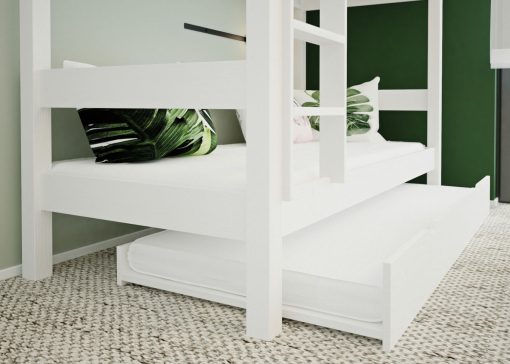 Η κουκέτα προσφέρει επίσης εκπληκτική ευελιξία με τη δυνατότητα προσθήκης ενός συρρόμενου συρταριού για την αποθήκευση κλινοσκεπασμάτων, παιχνιδιών και άλλων αντικειμένων, καθώς και ένα συρρόμενο κρεβάτι φιλοξενίας για επιπλέον χώρο ύπνου, ιδανικό για προσκλήσεις φίλων ή οικογενειακά μέλη.