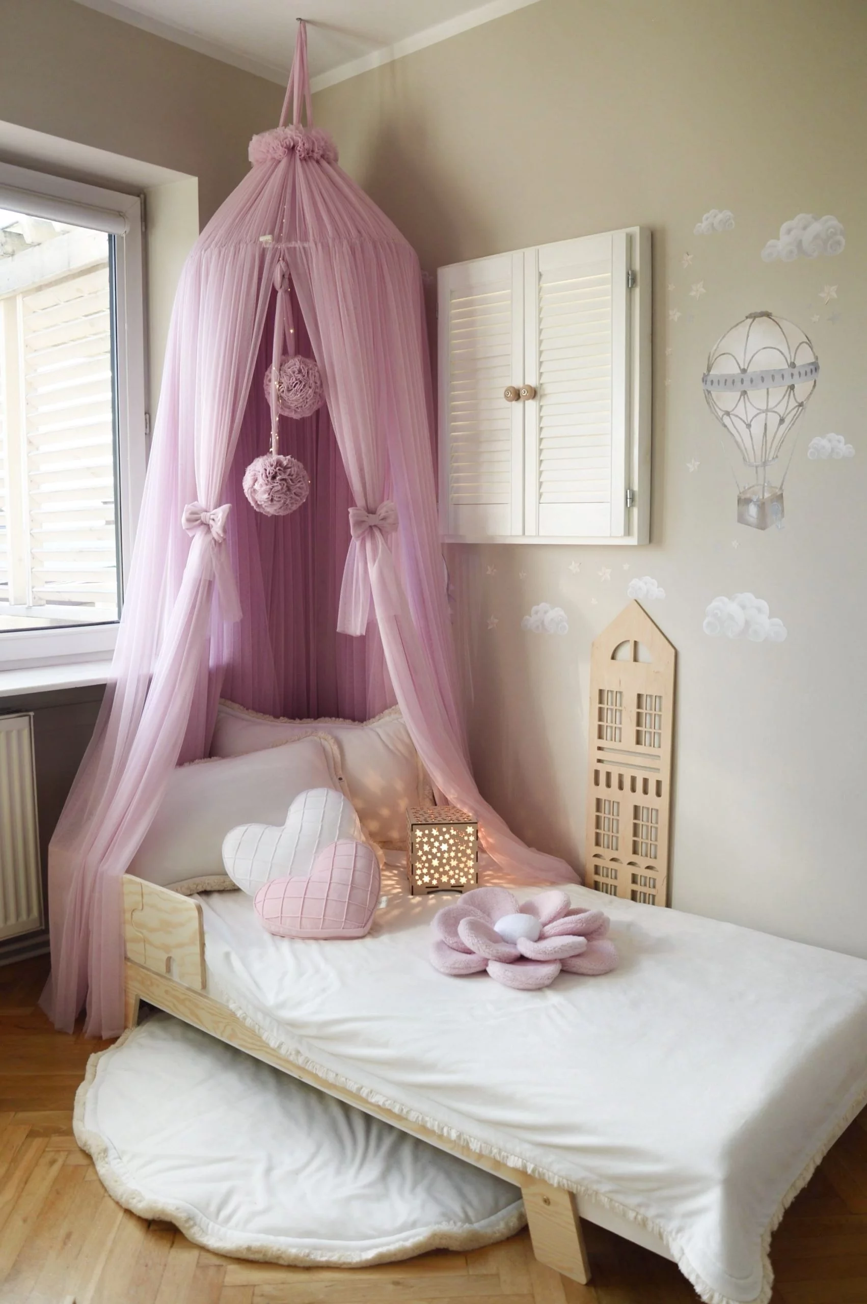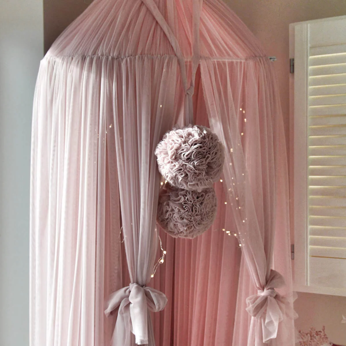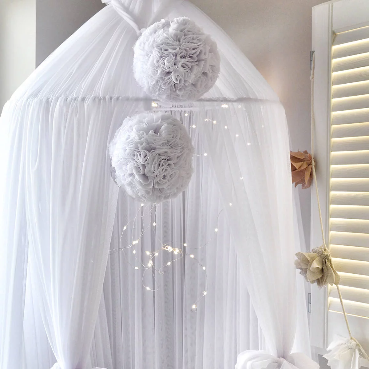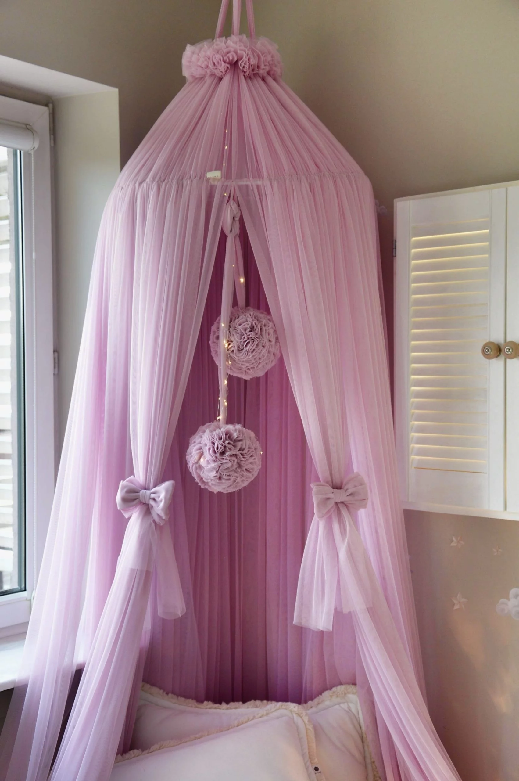 Το σετ περιλαμβάνει: Διαστάσεις: Διάμετρος canopy 60 εκ. Ύψος 240 εκ Μήκος του κορδονιού (το οποίο μπορεί να κρεμαστεί από το ταβάνι) 60 εκ. Πώς να φροντίσετε ένα τούλινο canopy: σκουπίστε τακτικά, καθαρίστε το σκουπίζοντας με ένα πανί Συμπεριλαμβανομένος: Θόλος Δύο πομπόν Κρίκος Τόξα