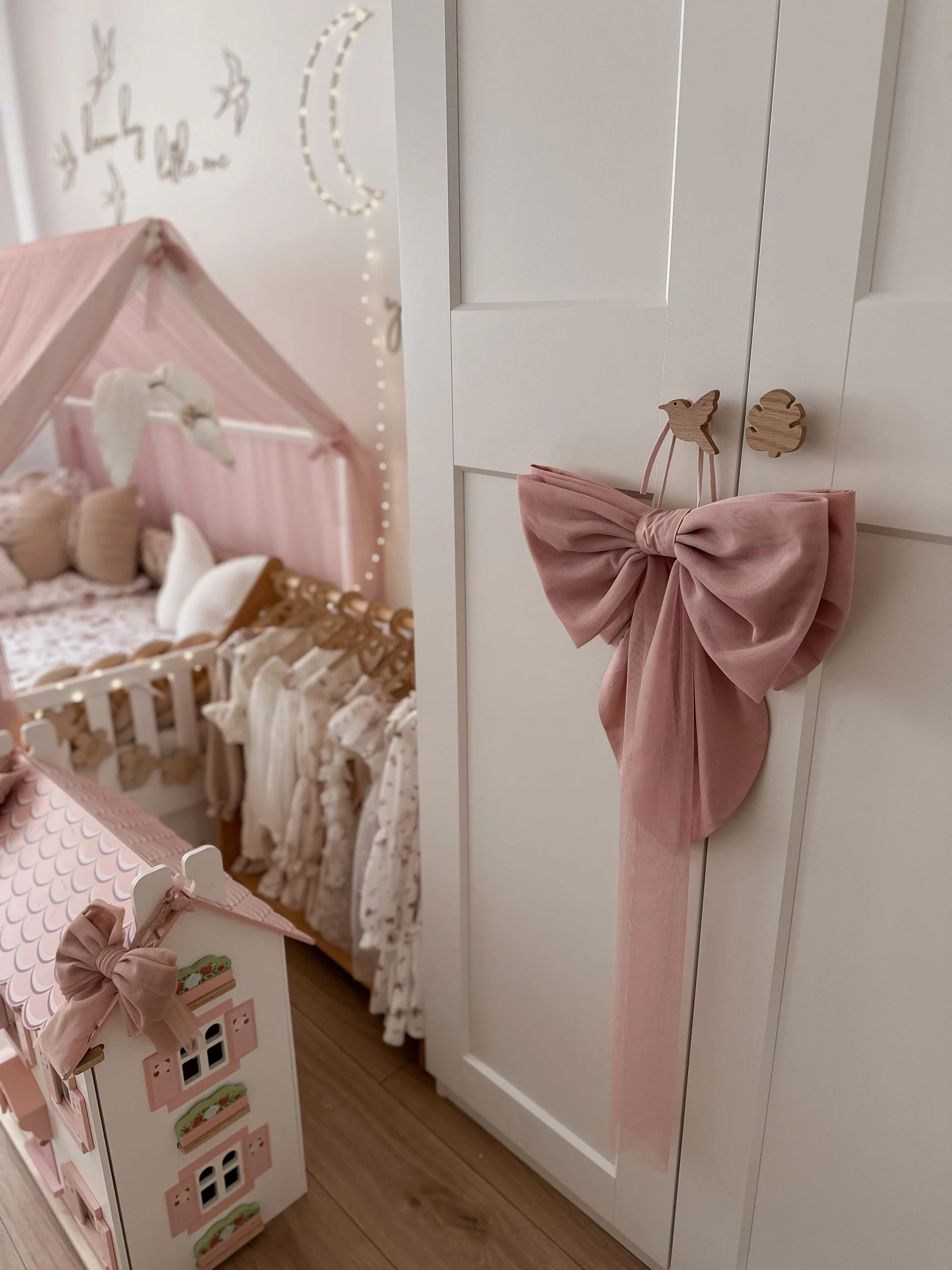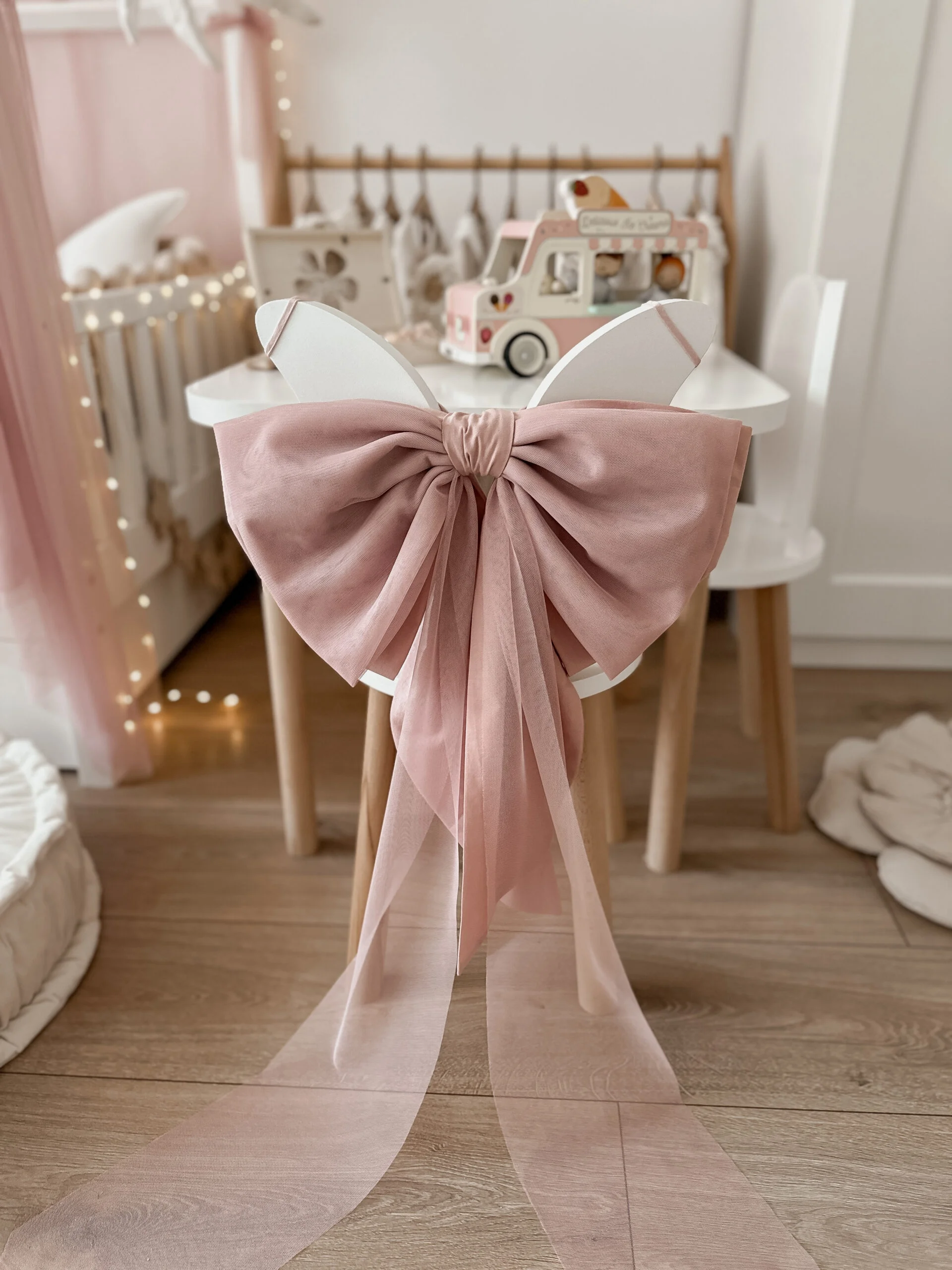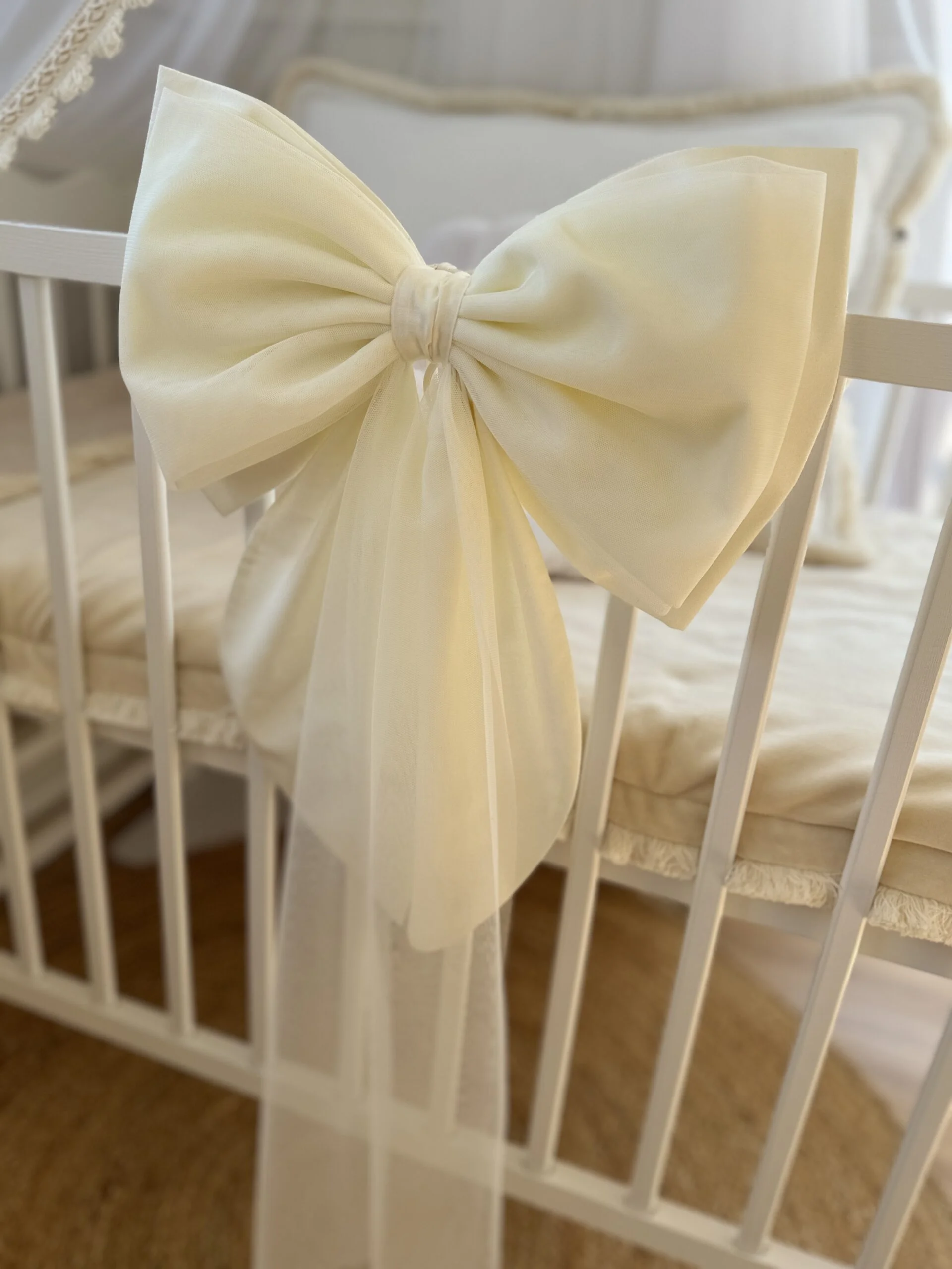 Ένας όμορφος μεγάλος βαμβακερός φιόγκος στο κάτω μέρος με απαλό τούλι από πάνω. Φανταστική διακόσμηση για το δωμάτιο μιας πριγκίπισσας. Μπορείτε να το κρεμάσετε σε θόλο, ντουλάπα, κρεβάτι ή πάνω από ένα παράθυρο. Το χρώμα του βαμβακιού ταιριάζει με το χρώμα του τούλι. Διαστάσεις περίπου: 40×25εκ.
