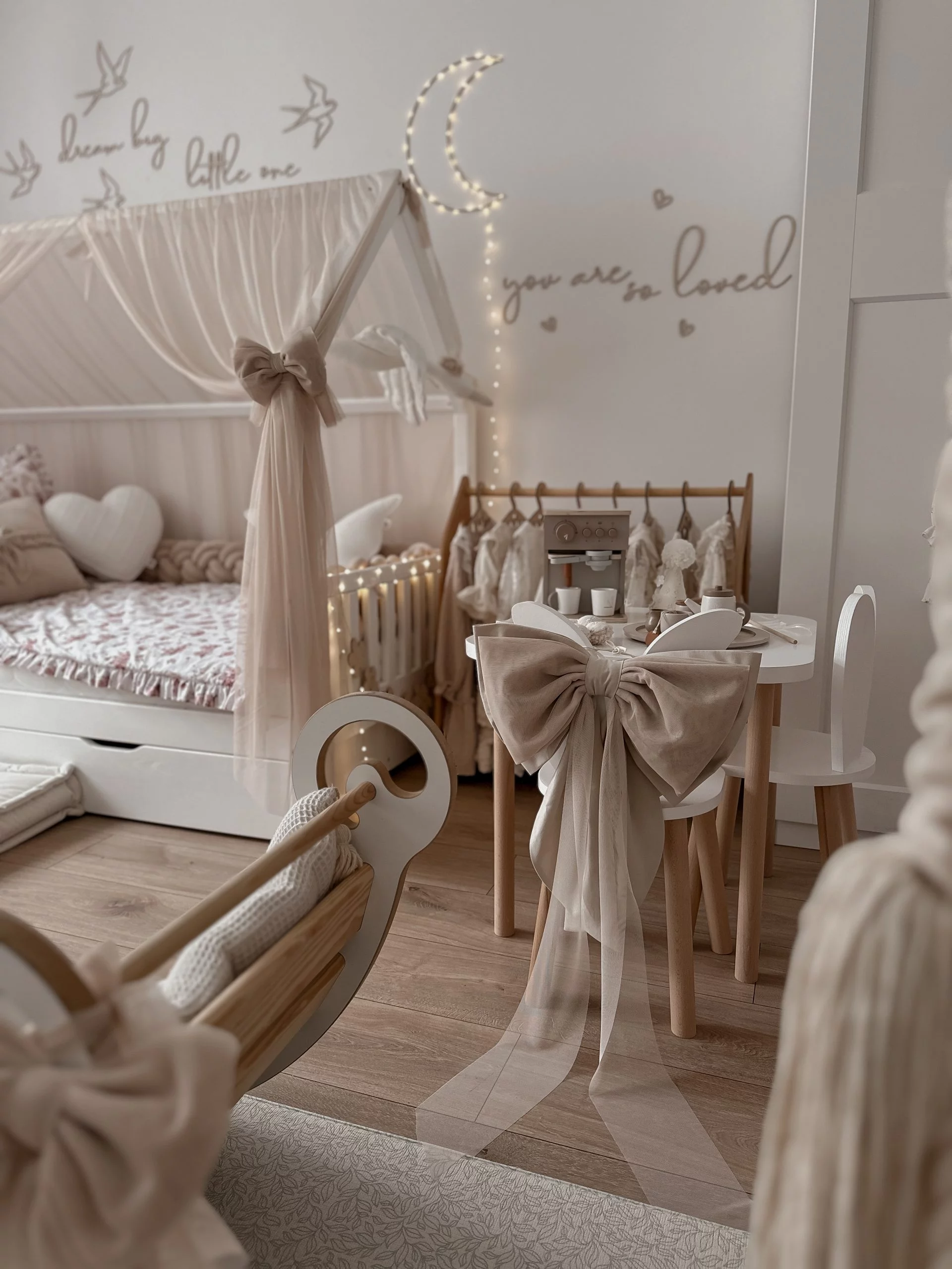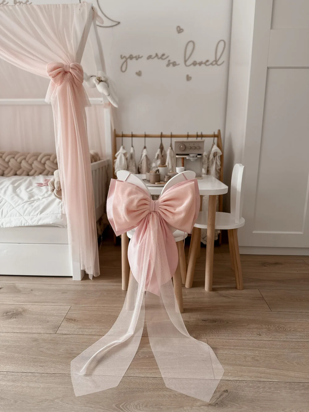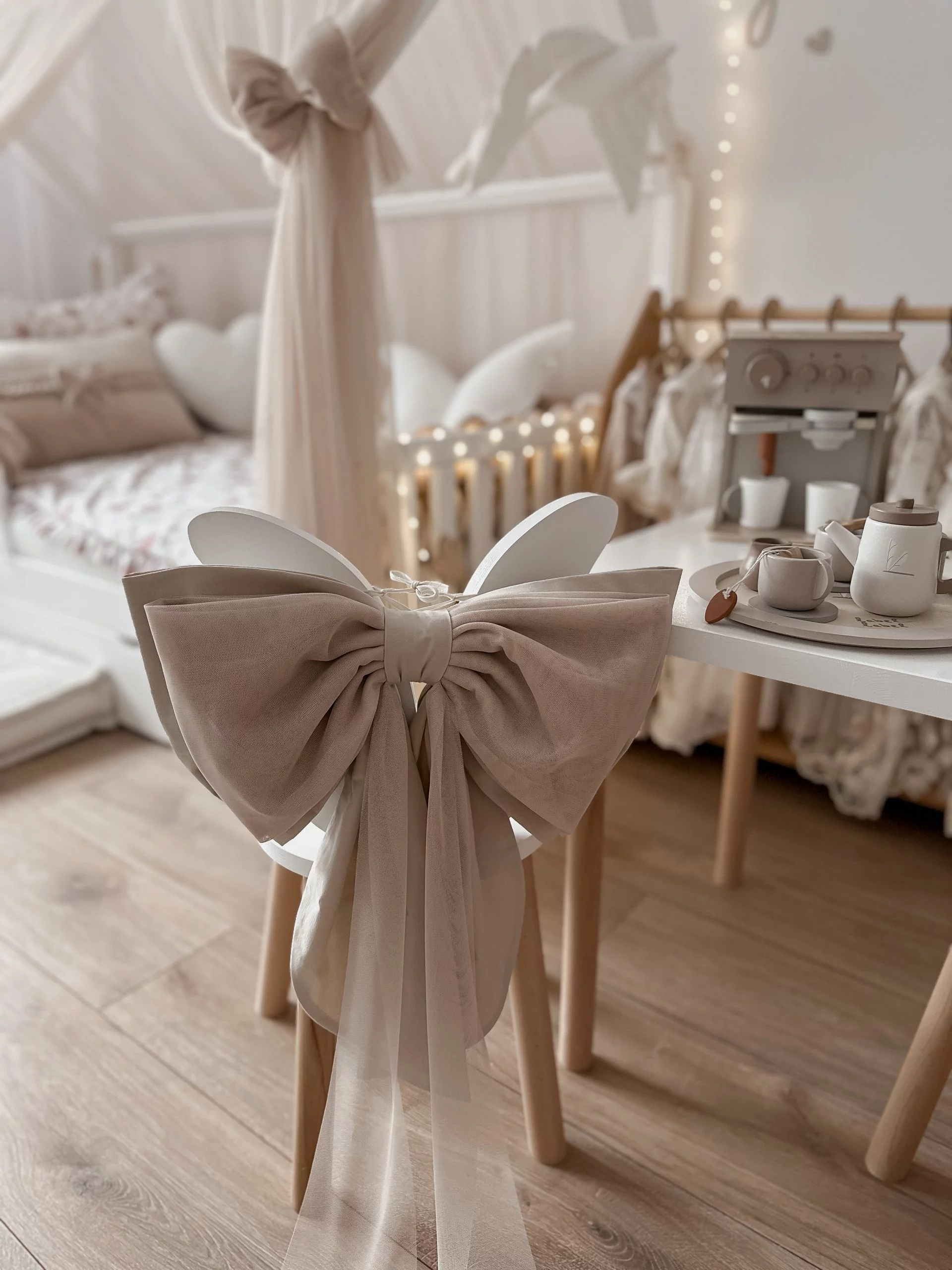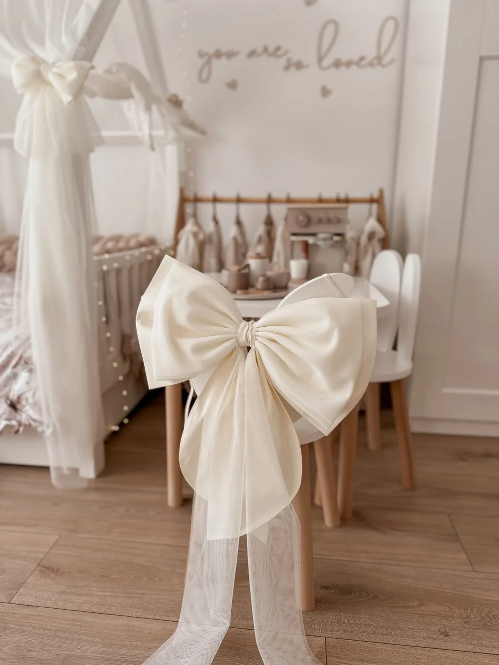 Ένας όμορφος μεγάλος βαμβακερός φιόγκος στο κάτω μέρος με απαλό τούλι από πάνω. Φανταστική διακόσμηση για το δωμάτιο μιας πριγκίπισσας. Μπορείτε να το κρεμάσετε σε θόλο, ντουλάπα, κρεβάτι ή πάνω από ένα παράθυρο. Το χρώμα του βαμβακιού ταιριάζει με το χρώμα του τούλι. Διαστάσεις περίπου: 40×25εκ.