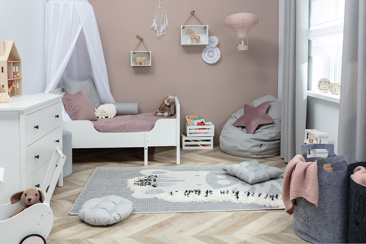 Γκρι-μπλε χαλί για παιδικό δωμάτιο με σχέδιο ζέβρας και απαλή χαίτη.