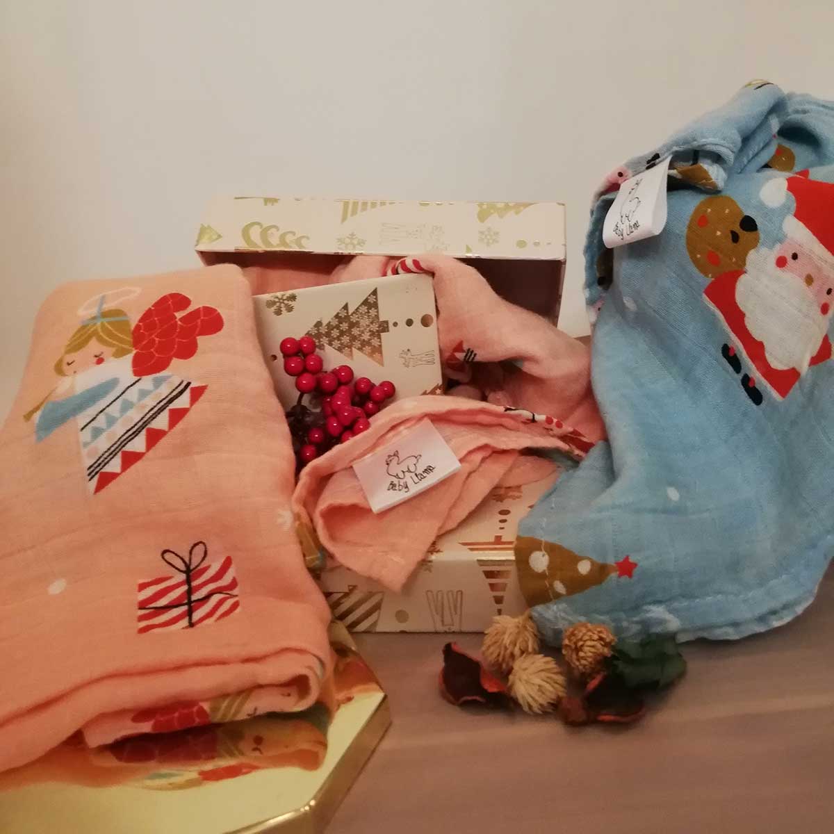 Χριστουγεννιάτικη Μουσελίνα από 70% Bamboo και 30% οργανικό βαμβάκι. Διαστάσεις: Μεγάλη 120×120 cm. Η μουσελίνα μπορεί να χρησιμοποιηθεί ως κάλυμμα καροτσιού, κουβερτάκι, για το φάσκιωμα του μωρού, πανάκι ρεψίματος , σεντονάκι ακόμη και ως κάλυμμα θηλασμού. Μπορούν να χρησιμοποιηθούν χειμώνα-καλοκαίρι. Τι είναι οι Μουσελίνες; Τι είναι αυτό που τις κάνει τόσο ιδανικές;