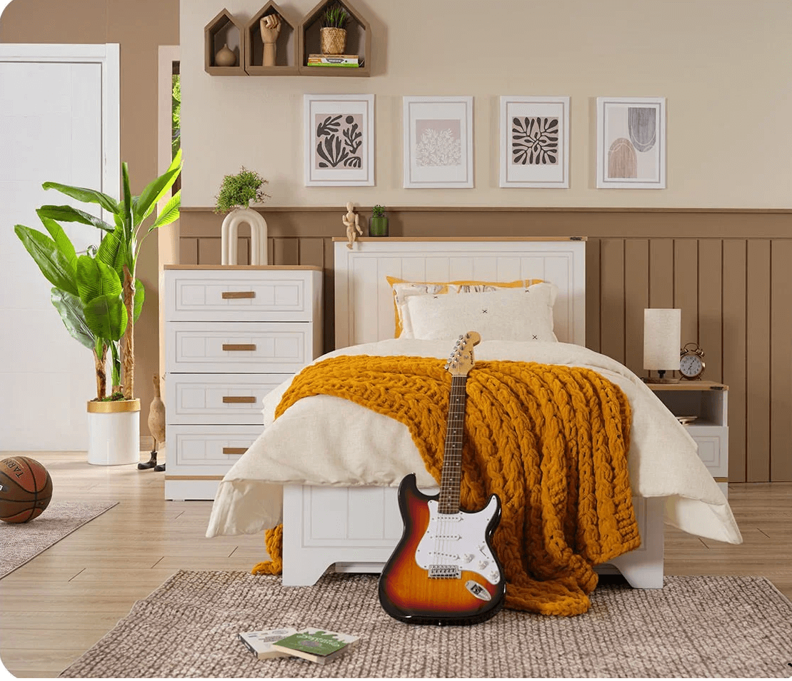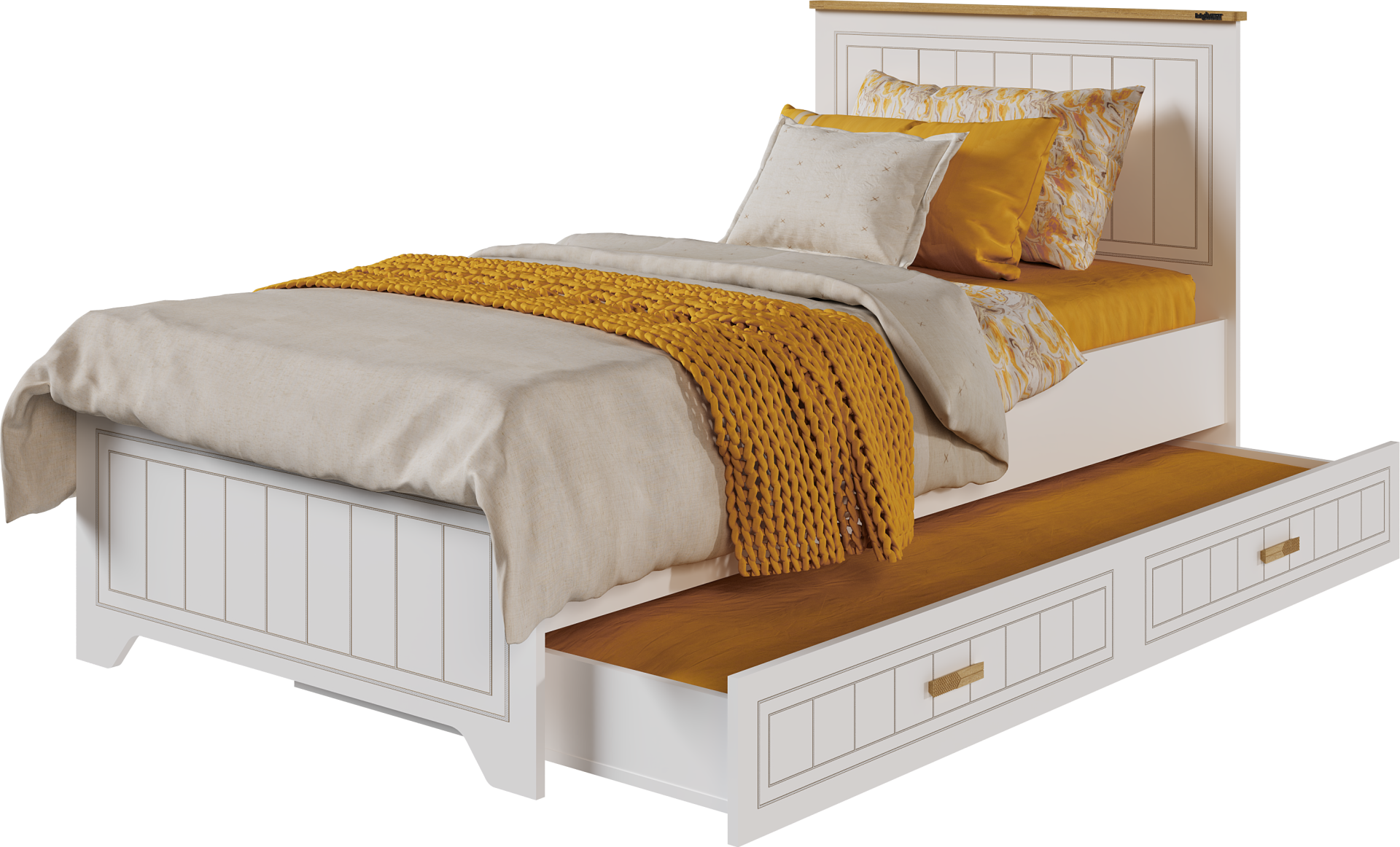 Κατασκευασμένο από μοριοσανίδα με επένδυση μελαμίνης, ιδιαίτερα ανθεκτική στο νερό και την υγρασία. Δεν περιέχει καρκινογόνες ουσίες και πληροί τα κριτήρια ασφάλειας για την ανθρώπινη υγεία. Με συρόμενο έξτρα κρεβάτι.