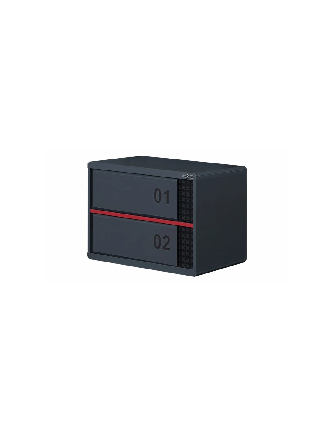 Διαθέτει δύο ευρύχωρα συρτάρια, αριθμημένα ως “01” και “02”, με κόκκινες λεπτομέρειες που προσδίδουν στυλ.