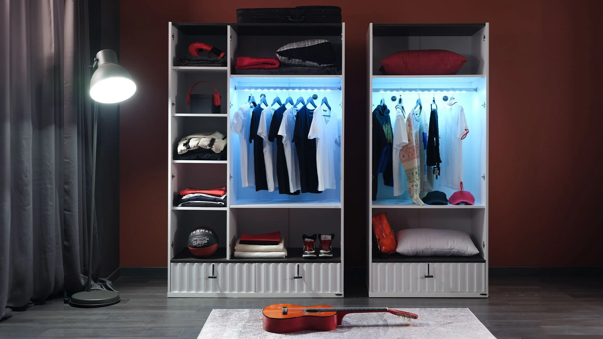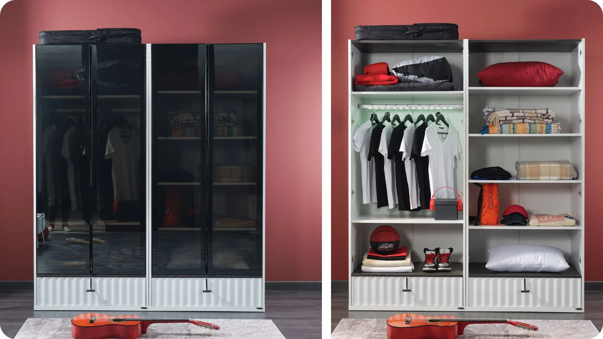 Η Δίφυλλη ντουλάπα με γυάλινη πόρτα Cool είναι αρκετά μεγάλη για να καλύψει τις ανάγκες του νέου και να έχει όλα του τα ρούχα πάντα τακτοποιημένα. Χαρακτηριστικά & Προνόμια Συμπεριλαμβάνονται