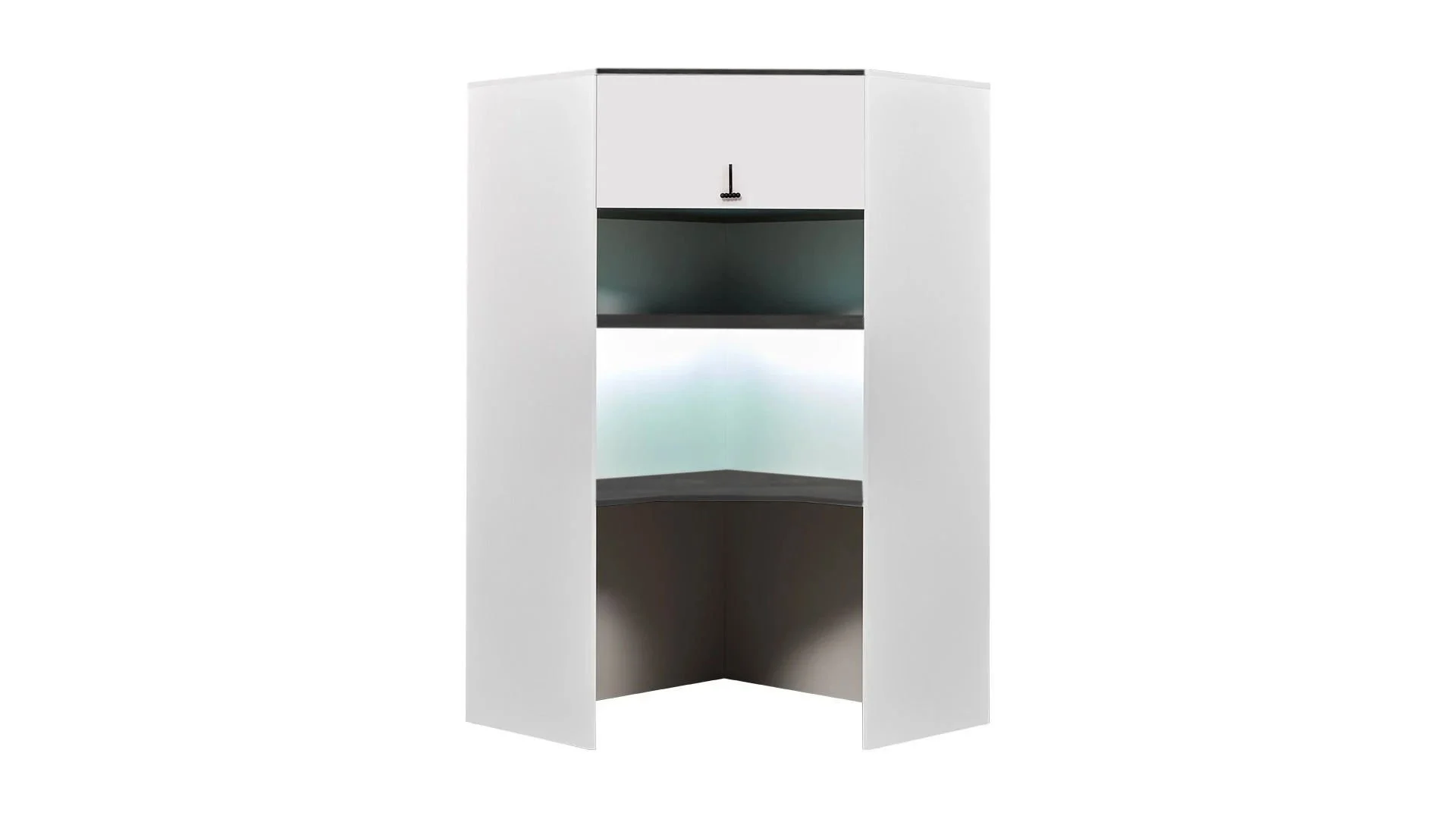 H Γωνιακό γραφείο με ντουλάπι Cool είναι αρκετά μεγάλη για να καλύψει τις ανάγκες του νέου και να έχει όλα του τα ρούχα πάντα τακτοποιημένα. Χαρακτηριστικά & Προνόμια * Μοριοσανίδα γενικής χρήσης με επικάλυψη μελαμίνης * Μεντεσέδες άνω καλύμματος με πώμα και έμβολο * Φωτισμός LED ημέρας ευαίσθητος στην αφή στο τμήμα εργασίας. * Διατίθεται συσκευή στερέωσης σε τοίχο για την ασφάλεια σεισμών και παιδιών. Συμπεριλαμβάνονται