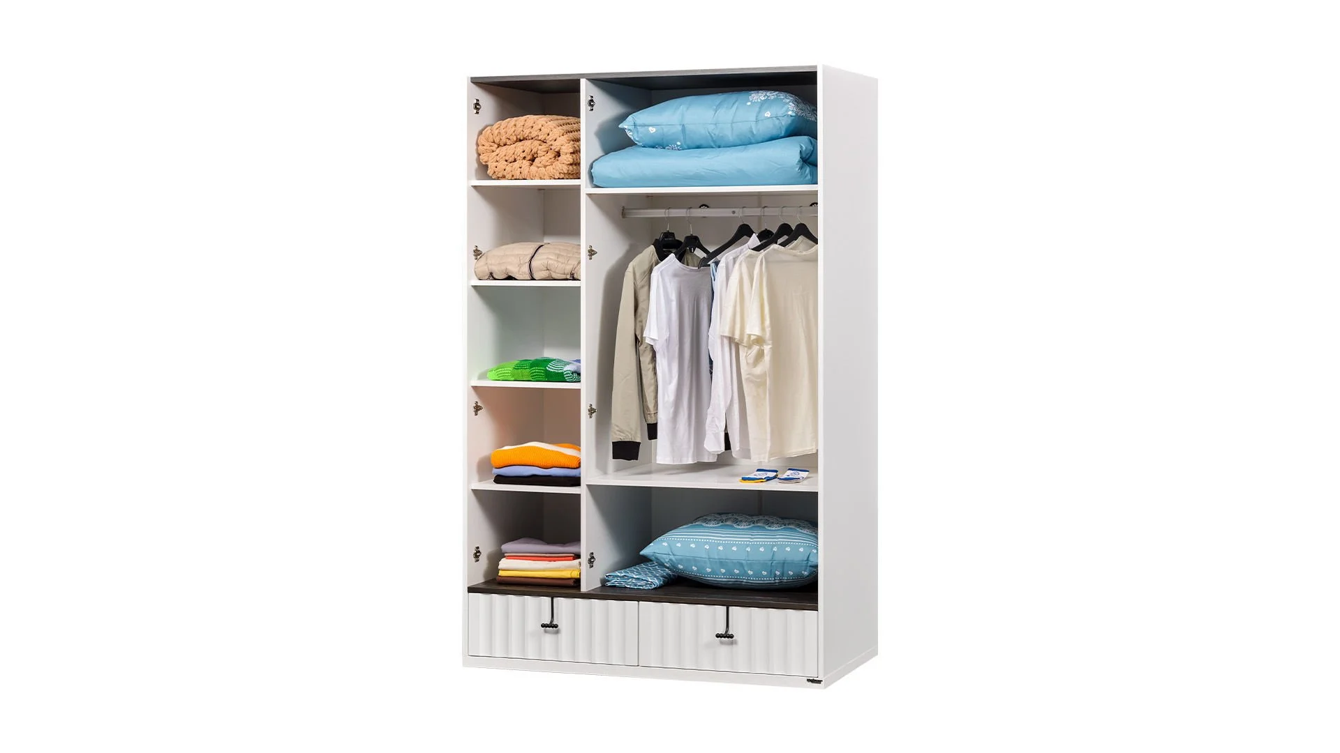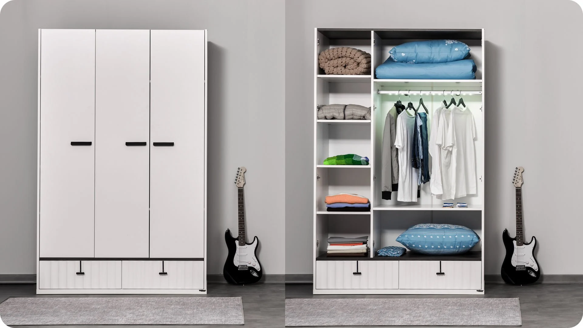 Η Τρίφυλλη ντουλάπα Cool συνδυάζει λειτουργικότητα και αισθητική, ιδανική για την οργάνωση κάθε χώρου. Με ευρύχωρους αποθηκευτικούς χώρους, κρεμάστρες, ράφια και δύο συρτάρια στη βάση, προσφέρει πρακτικότητα για ρούχα και αξεσουάρ. Ο μοντέρνος σχεδιασμός της με απαλές αποχρώσεις γκρι και λευκού την καθιστά ιδανική για παιδικά ή νεανικά δωμάτια, προσθέτοντας στυλ και οργάνωση στον χώρο σας. – Μοριοσανίδα γενικής χρήσης με επικάλυψη μελαμίνης και προφίλ mdf με επικάλυψη pvc – Μεντεσές με στοπ για ευκολία στη χρήση