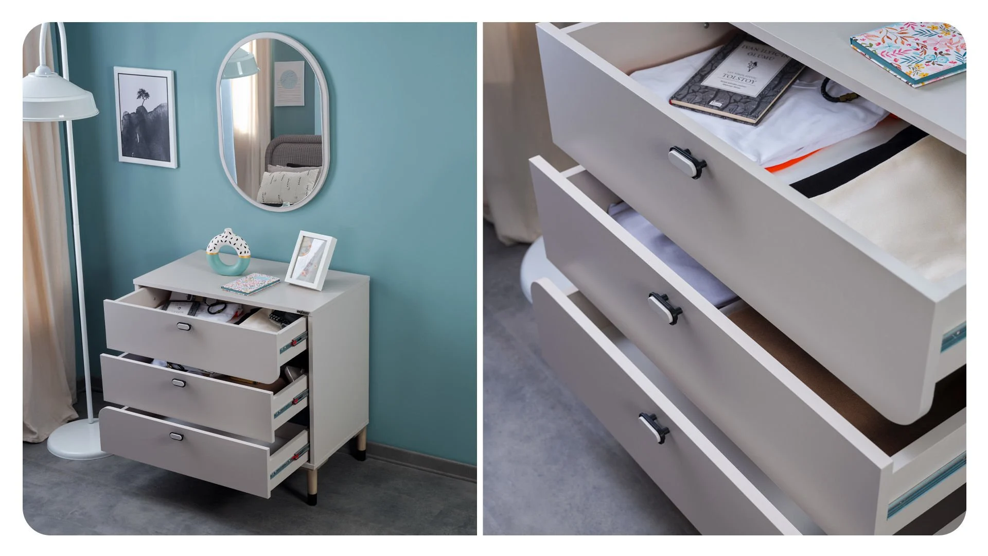 • Αποθηκευτικός χώρος: Διαθέτει τρία ευρύχωρα συρτάρια, ιδανικά για ρούχα, αξεσουάρ και άλλα προσωπικά αντικείμενα.