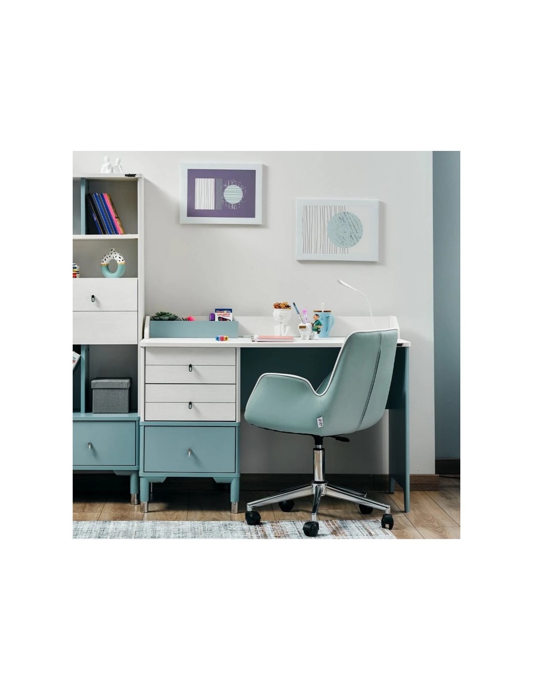 Η ενσωματωμένη συρταριέρα περιλαμβάνει τρία συρτάρια σε λευκή απόχρωση και ένα μεγαλύτερο συρτάρι σε σιέλ χρώμα στο κάτω μέρος, προσφέροντας άφθονο αποθηκευτικό χώρο για γραφική ύλη, βιβλία και προσωπικά αντικείμενα. Τα μεταλλικά πόδια της συρταριέρας και οι λαβές προσθέτουν μια μοντέρνα πινελιά και εξασφαλίζουν σταθερότητα.