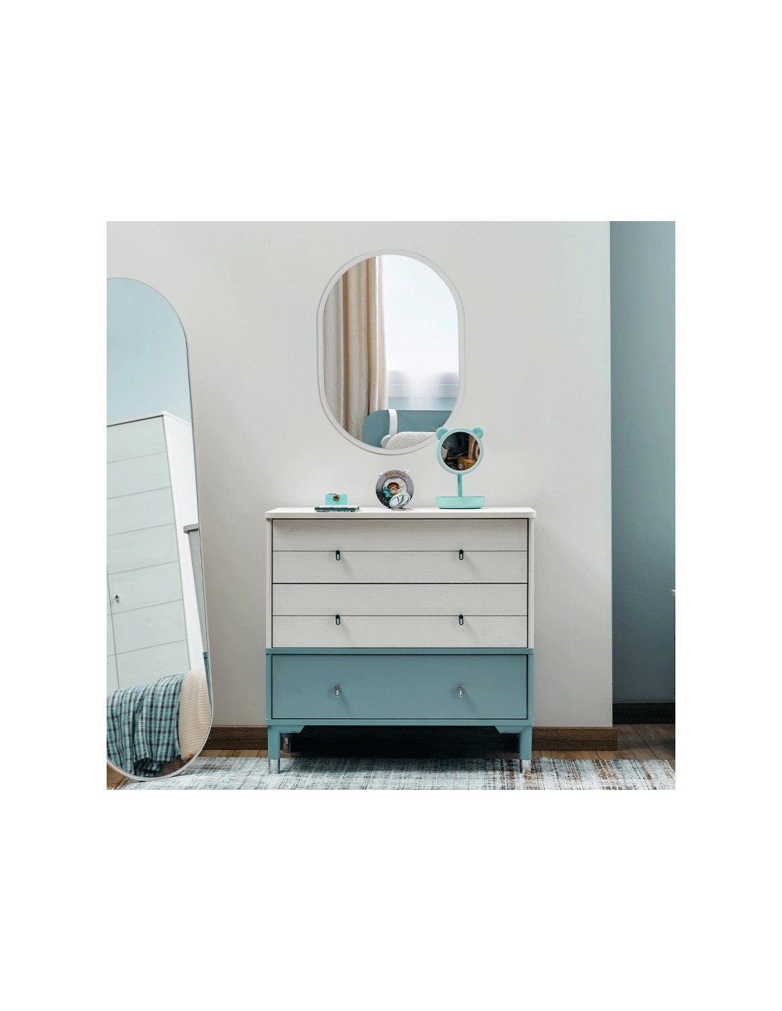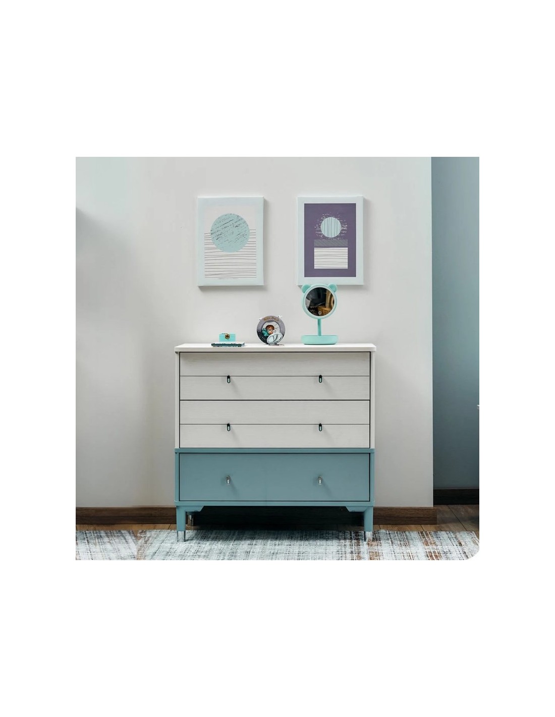 Διαθέτει έναν όμορφο δίχρωμο συνδυασμό, με λευκή απόχρωση στο επάνω μέρος και μπλε χρώμα στο κάτω μέρος, προσφέροντας μια μοντέρνα και δροσερή αίσθηση. Είναι εξοπλισμένη με τρία ευρύχωρα συρτάρια, εκ των οποίων τα δύο πάνω είναι λευκά και το κάτω μεγαλύτερο είναι μπλε, προσφέροντας άφθονο αποθηκευτικό χώρο για ρούχα, παιχνίδια ή άλλα αντικείμενα.