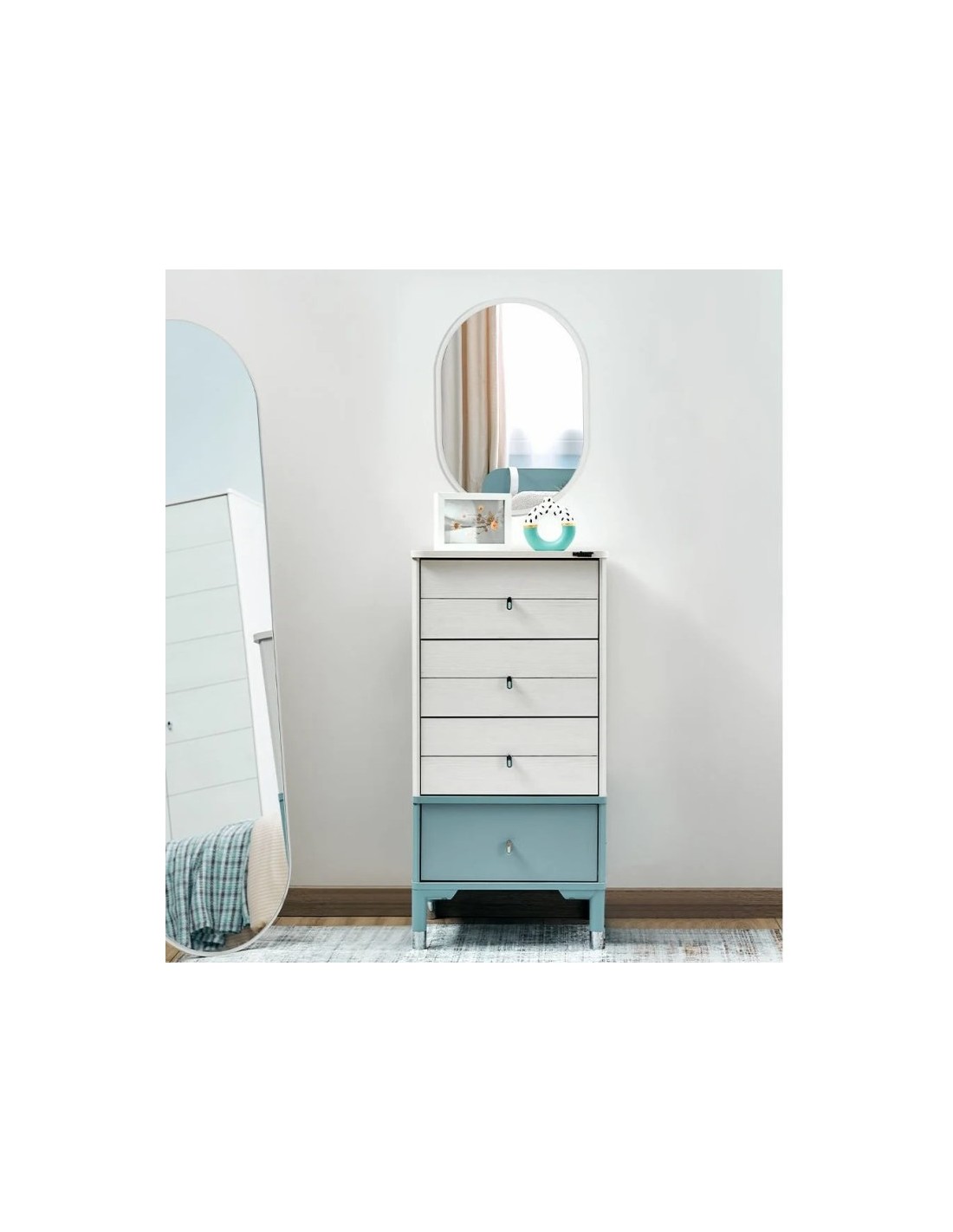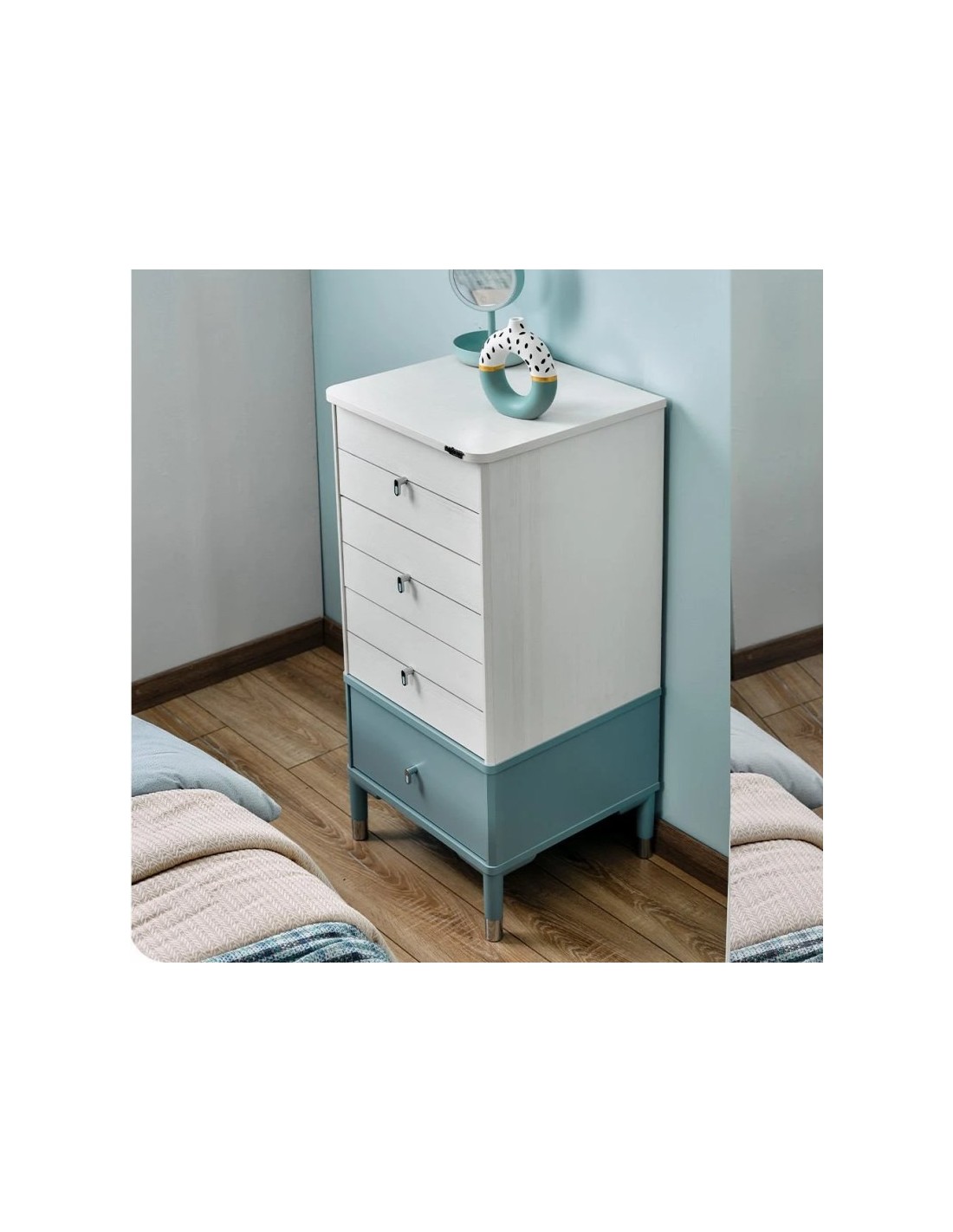 Διαθέτει τέσσερα ευρύχωρα συρτάρια σε διακριτικό λευκό / μπλε χρώμα, που προσδίδουν μια μοντέρνα πινελιά.