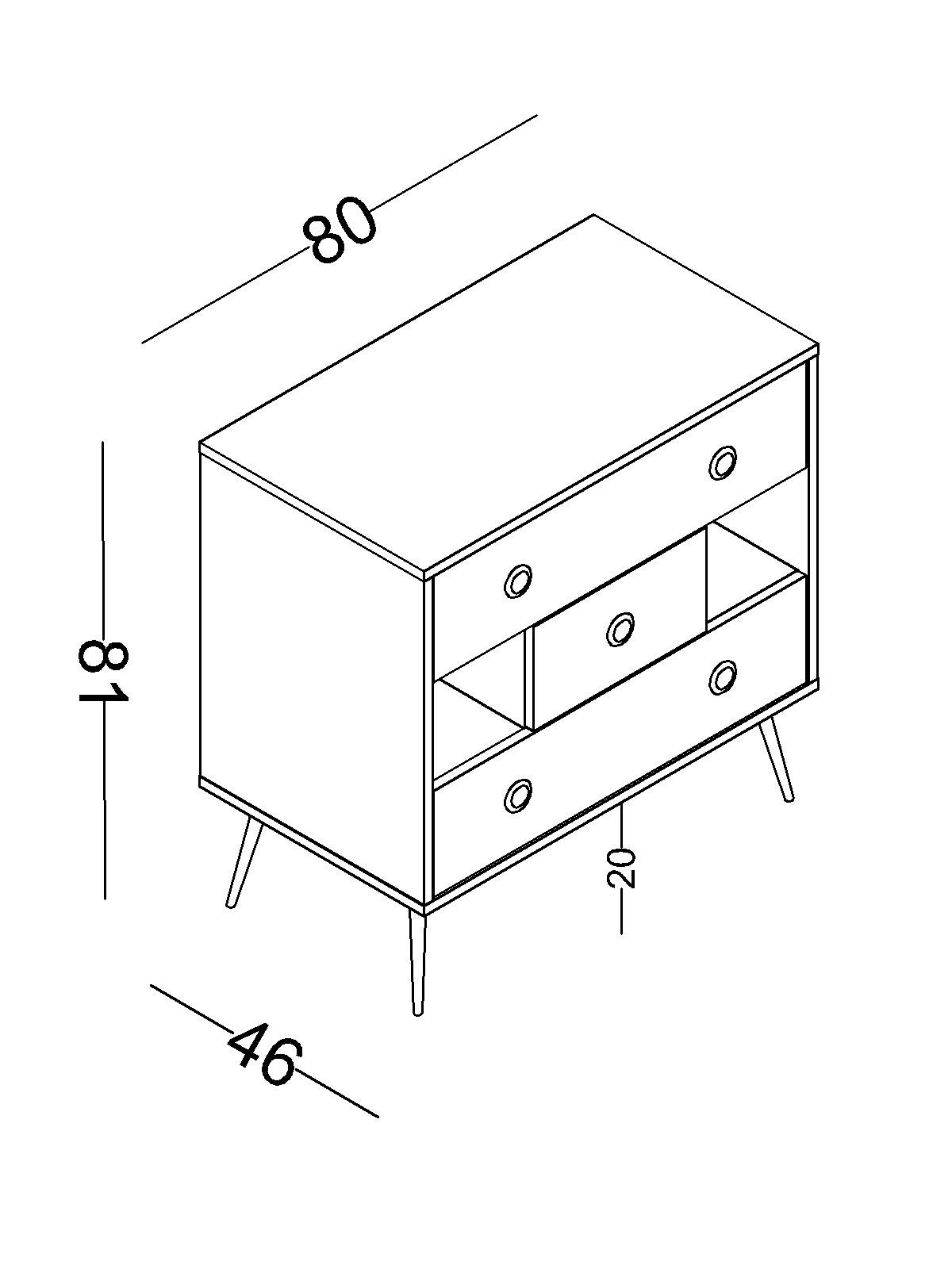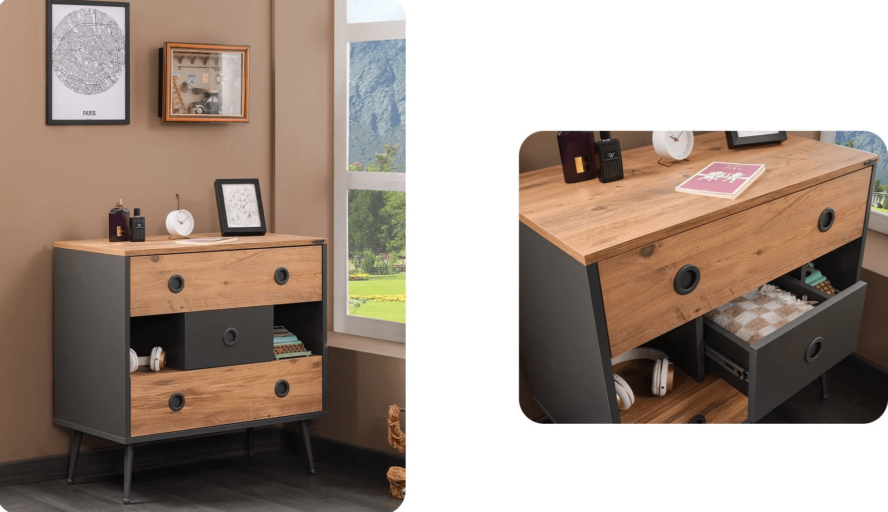 Διαθέτει δύο ευρύχωρα συρτάρια σε μαύρο χρώμα και ένα στο χρώμα του ξύλου, που προσδίδουν μια μοντέρνα πινελιά.