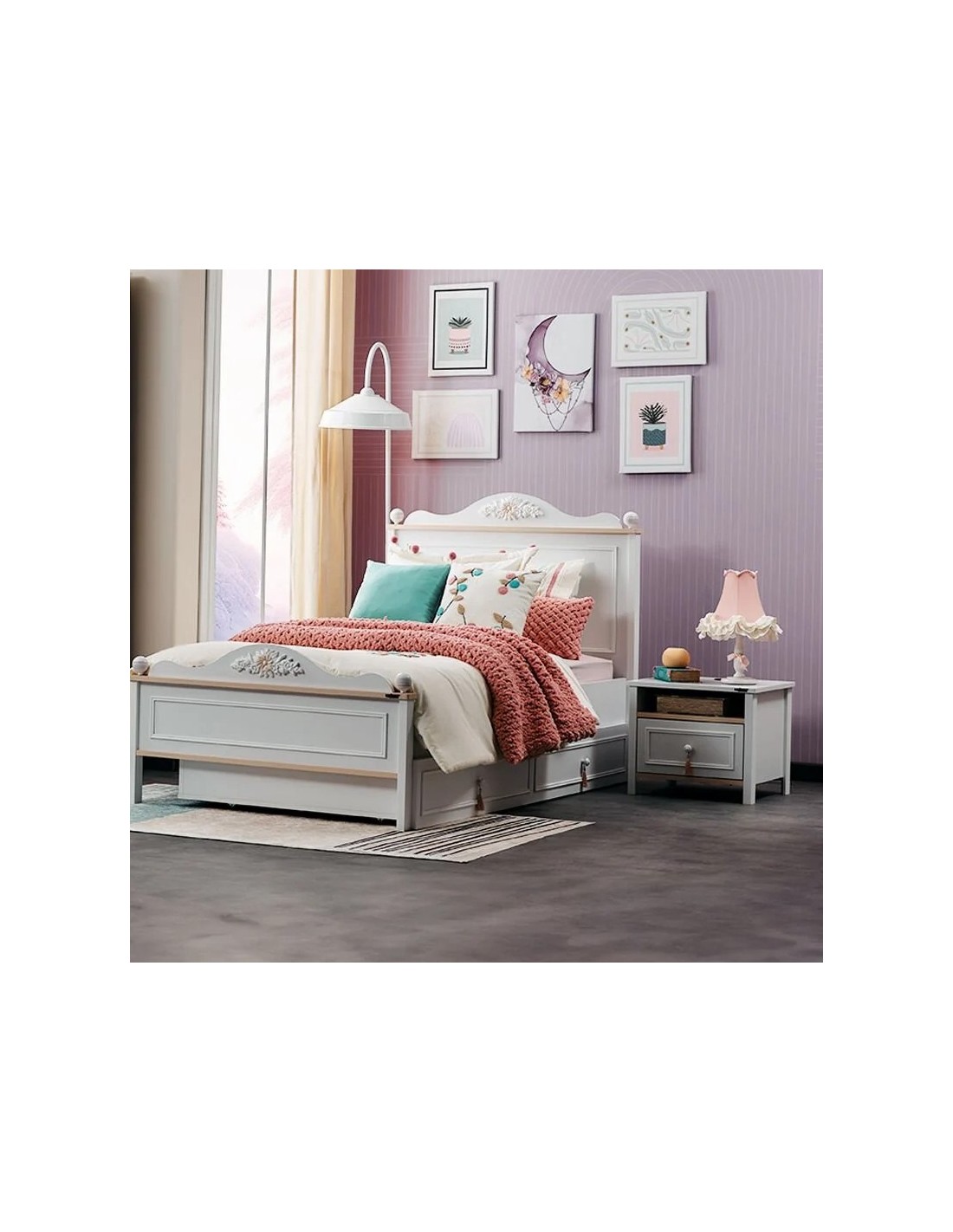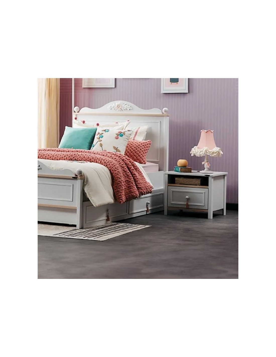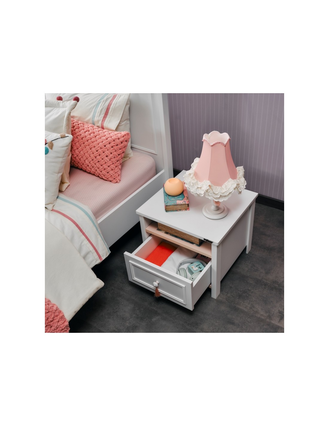 Το κομοδίνο Alya συνδυάζει πρακτικότητα και κομψότητα, ιδανικό για παιδικά ή νεανικά δωμάτια. Ο αρμονικός συνδυασμός απαλού ροζ και λευκού χρώματος, μαζί με τα κομψά χερούλια, προσδίδουν μια ρομαντική και μοντέρνα αισθητική στον χώρο σας.