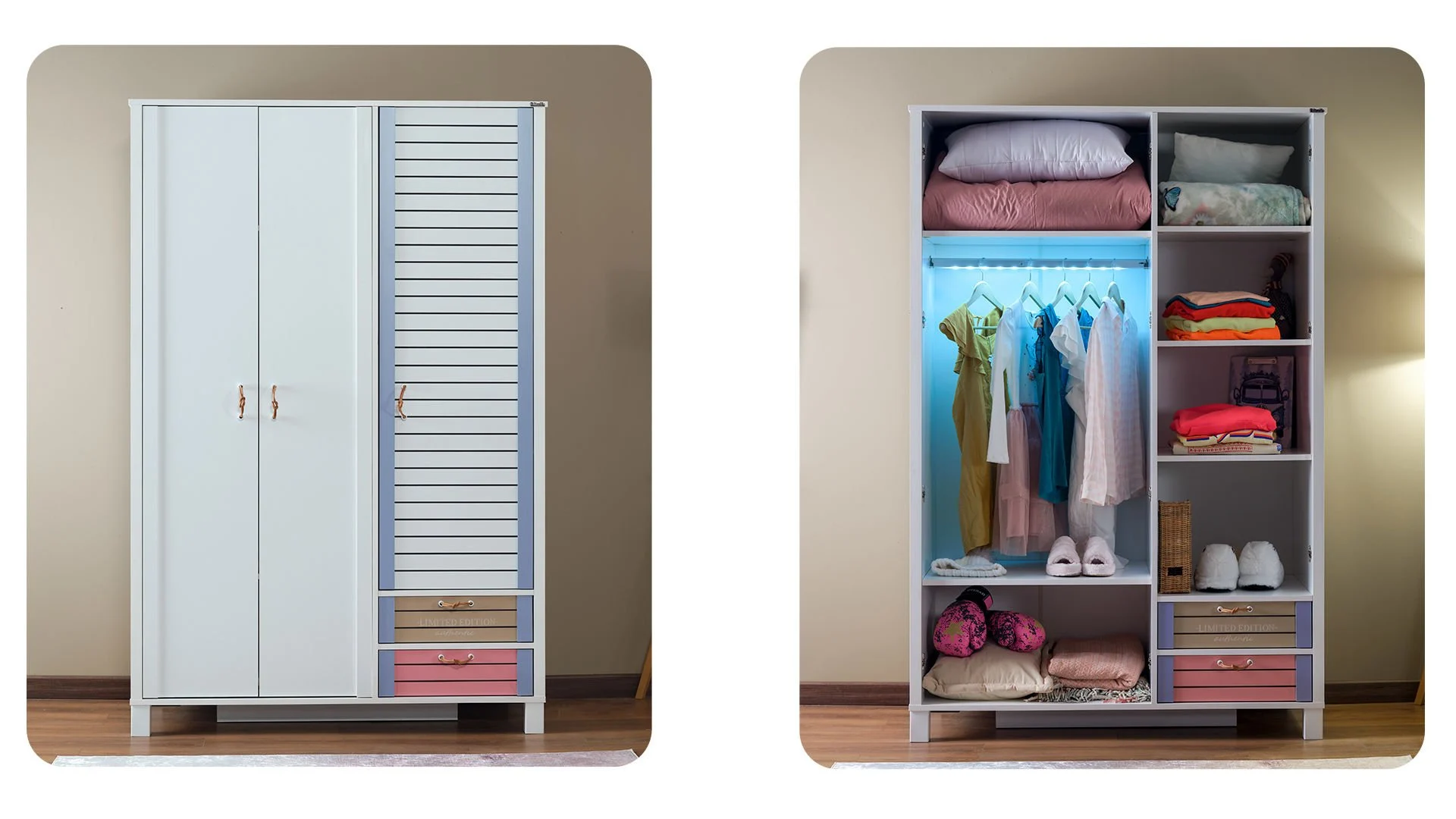 Με ευρύχωρους αποθηκευτικούς χώρους, κρεμάστρες, ράφια και δύο συρτάρια στη βάση, προσφέρει πρακτικότητα για ρούχα και αξεσουάρ.