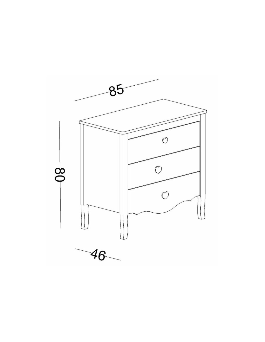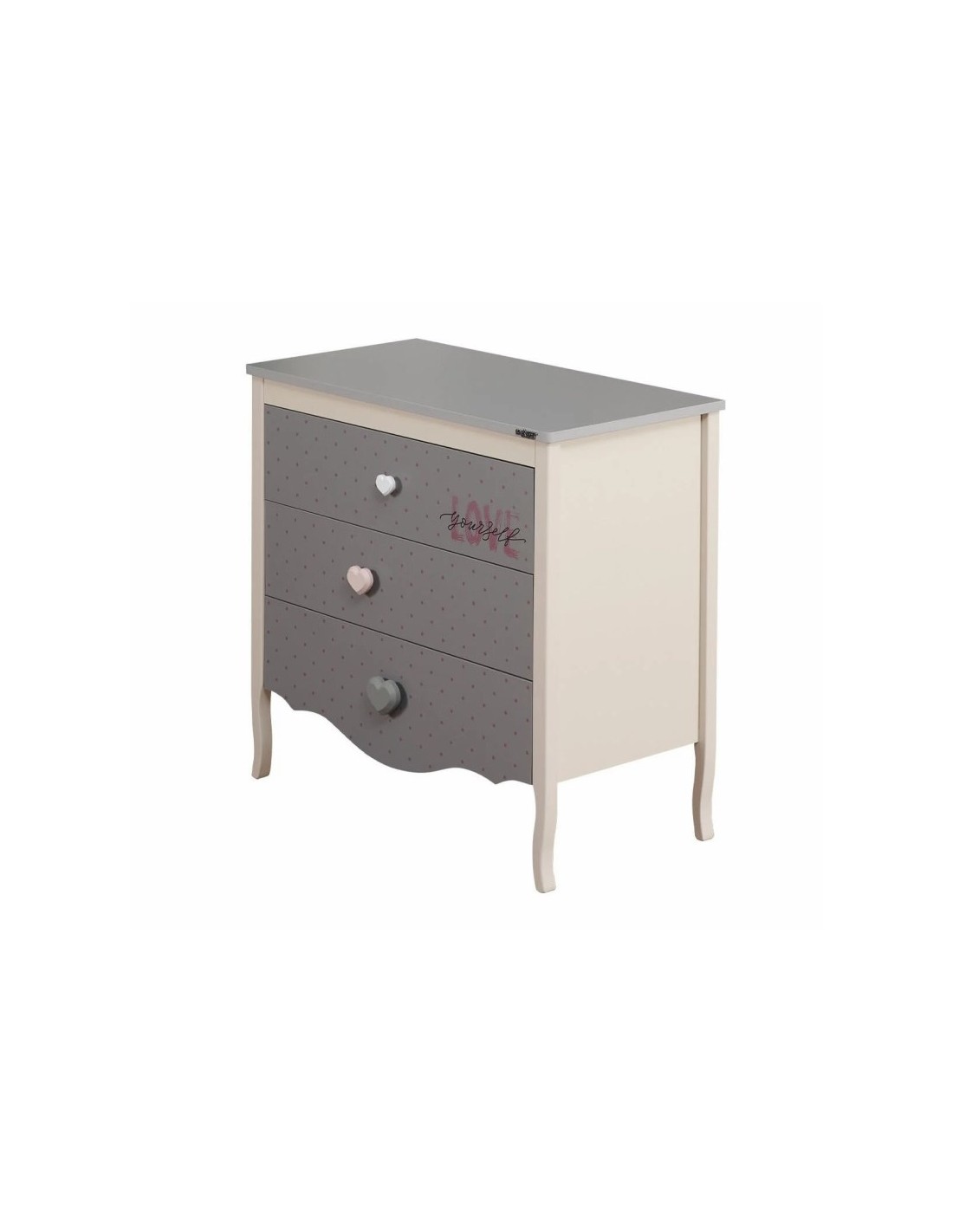 Διαθέτει τρία ευρύχωρα συρτάρια που παρέχουν άφθονο αποθηκευτικό χώρο για ρούχα, παιχνίδια, βιβλία ή προσωπικά αντικείμενα. Οι λαβές σε σχήμα καρδιάς προσδίδουν μια ιδιαίτερη, χαριτωμένη πινελιά, ενώ οι καμπυλωτές λεπτομέρειες στη βάση και τα πόδια ενισχύουν την κλασική αισθητική του επίπλου.