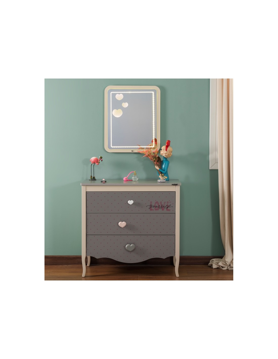 Η συρταριέρα Juliet αποτελεί μια κομψή και λειτουργική επιλογή για παιδικά και εφηβικά δωμάτια, συνδυάζοντας αισθητική και πρακτικότητα. Ο ρομαντικός της σχεδιασμός, με γκρι επιφάνειες διακοσμημένες με διακριτικά μοτίβα και την προσθήκη της λέξης “LOVE”, δίνει μια παιχνιδιάρικη και ζεστή αίσθηση.