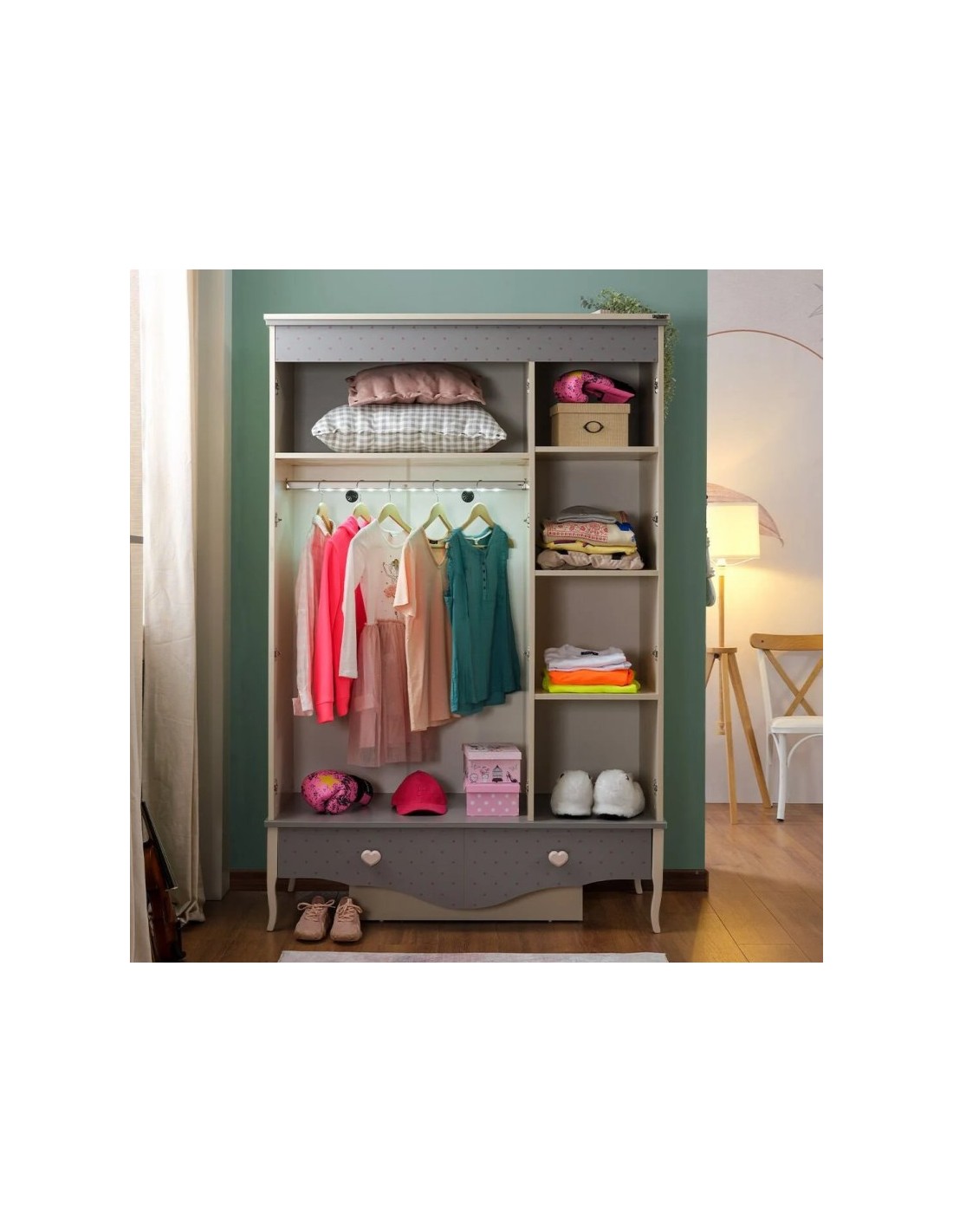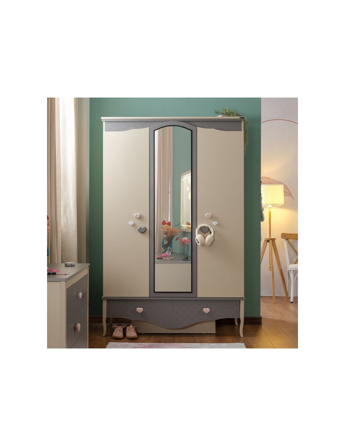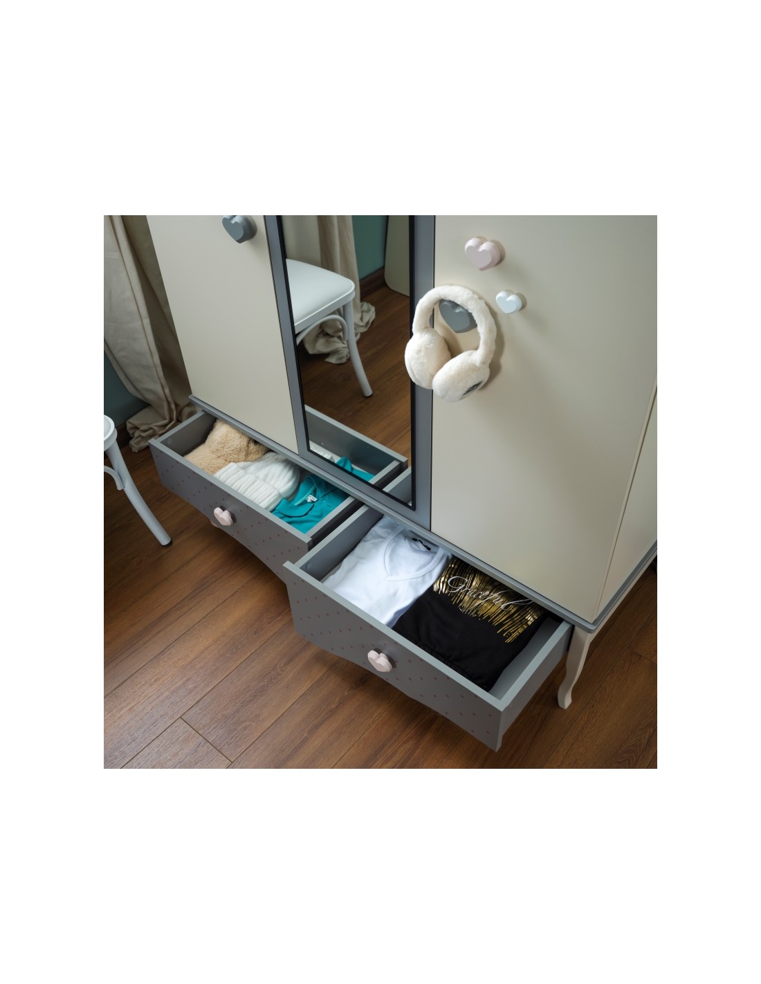 Η ντουλάπα Juliet είναι μια κομψή και λειτουργική επιλογή για παιδικά και εφηβικά δωμάτια, που συνδυάζει ρομαντική αισθητική και πρακτικότητα. Ο σχεδιασμός της, με απαλούς τόνους λευκού και γκρι, διακριτικά μοτίβα και λαβές σε σχήμα καρδιάς, δημιουργεί μια ζεστή και φιλόξενη ατμόσφαιρα.