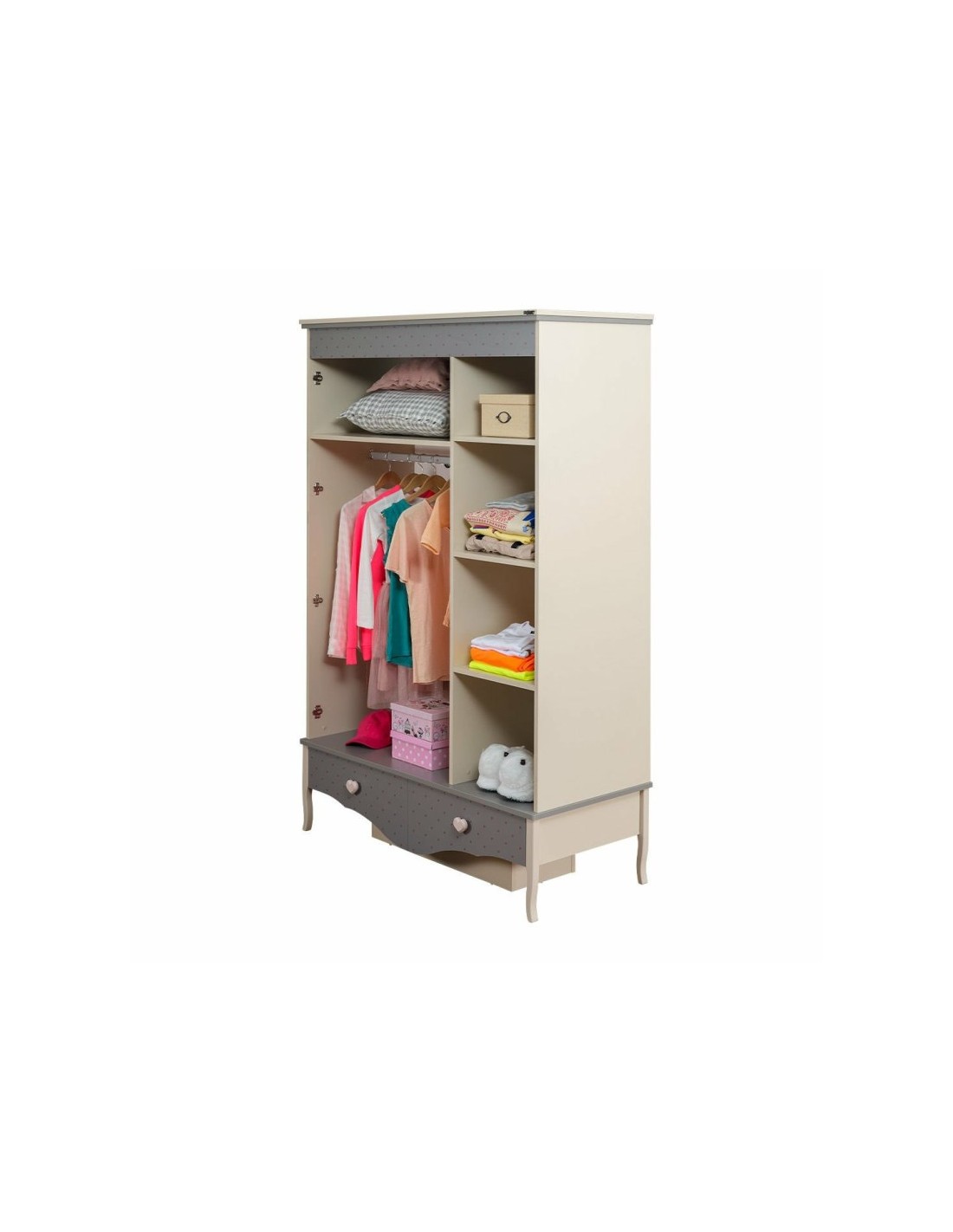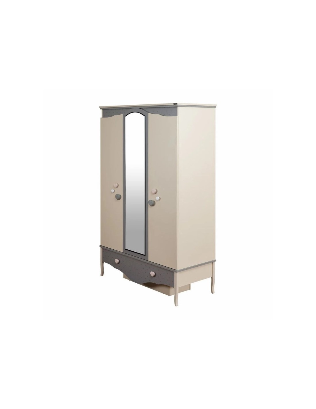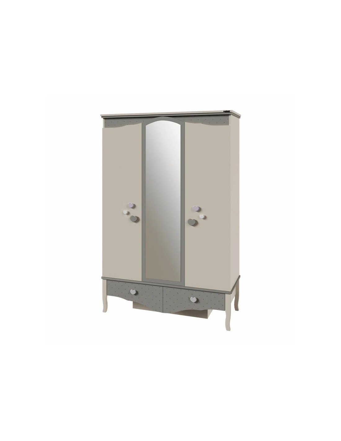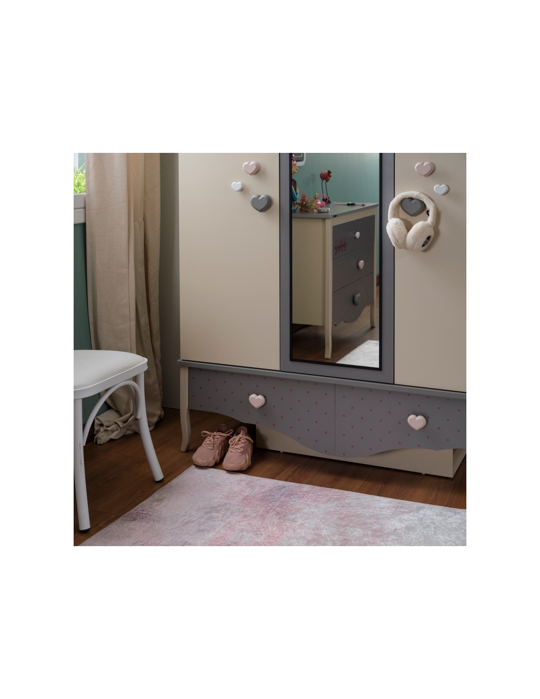 Η ντουλάπα Juliet είναι μια κομψή και λειτουργική επιλογή για παιδικά και εφηβικά δωμάτια, που συνδυάζει ρομαντική αισθητική και πρακτικότητα. Ο σχεδιασμός της, με απαλούς τόνους λευκού και γκρι, διακριτικά μοτίβα και λαβές σε σχήμα καρδιάς, δημιουργεί μια ζεστή και φιλόξενη ατμόσφαιρα.