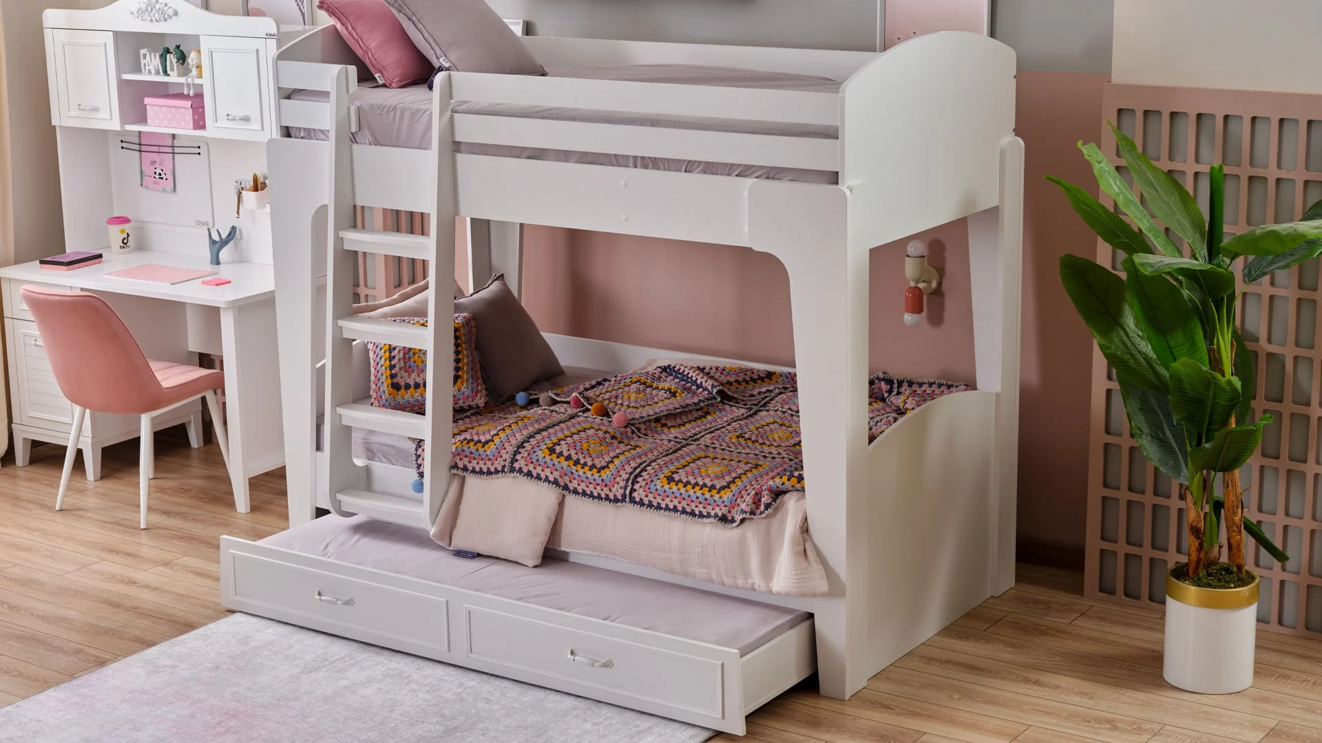 Ανακάλυψε τη μαγεία της Marje! Με πάνω κρεβάτι 100 x 200 εκ., κάτω κρεβάτι 100 x 200 εκ. και ένα έξυπνο συρόμενο κρεβάτι 90 x 180 εκ., όλα προσβάσιμα μέσω της στιλάτης και ασφαλούς σκάλας, το δωμάτιο γίνεται ένας χώρος για παιχνίδι, ξεκούραση και χαρούμενες στιγμές με φίλους ή αδέρφια. Ανθεκτική, πρακτική και γεμάτη στυλ – η Marje μεγαλώνει μαζί με τα παιδιά! Συρόμενο κρεβάτι: 208εκ. 24 εκ. 124εκ.