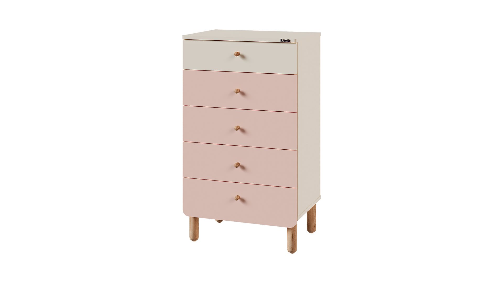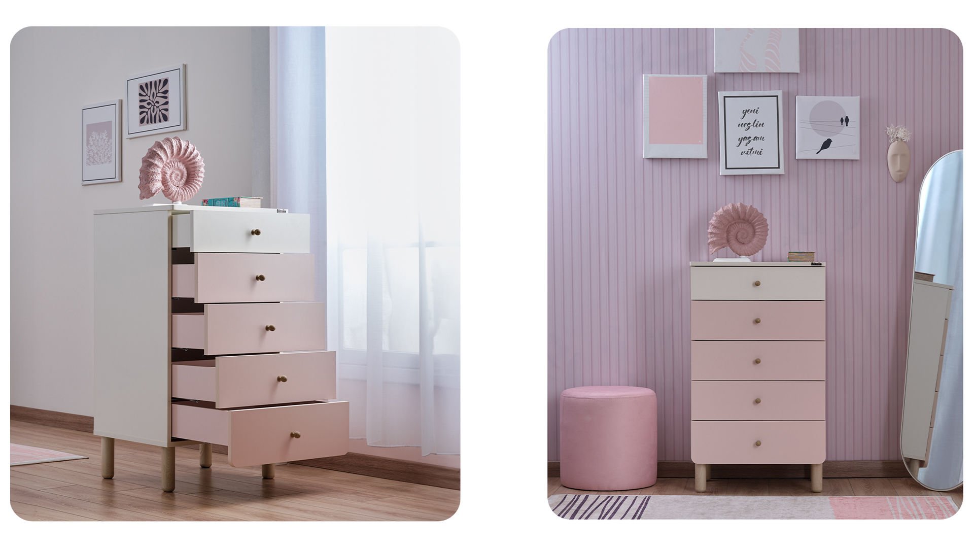 Διαθέτει πέντε ευρύχωρα συρτάρια σε απαλό ροζ χρώμα που προσδίδουν μια ρομαντική και μοντέρνα πινελιά.