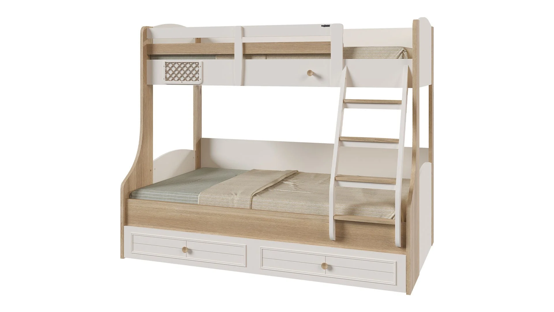 Το κάτω κρεβάτι είναι ημίδιπλο με διαστάσεις 120×200 εκ., ενώ το πάνω κρεβάτι έχει διαστάσεις 90×200 εκ., προσφέροντας άνετο χώρο για ύπνο. Το συρόμενο κρεβάτι που βρίσκεται στη βάση της κουκέτας διαθέτει αρκετό χώρο για κανονικό στρώμα, καθιστώντας το ιδανική λύση για φιλοξενούμενους ή επιπλέον χρήση. Μπορεί να χρησιμοποιηθεί είτε σαν κρεβάτι είτε σαν αποθηκευτικός χώρος.