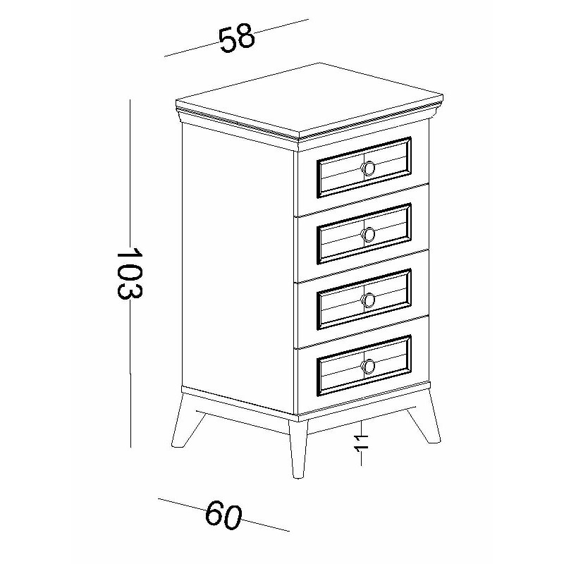 Διαθέτει 4 ευρύχωρα συρτάρια σε διακριτικό λευκό χρώμα, με επάνω συρτάρι σε απαλό ροζ, που προσδίδουν μια ρομαντική και μοντέρνα πινελιά.