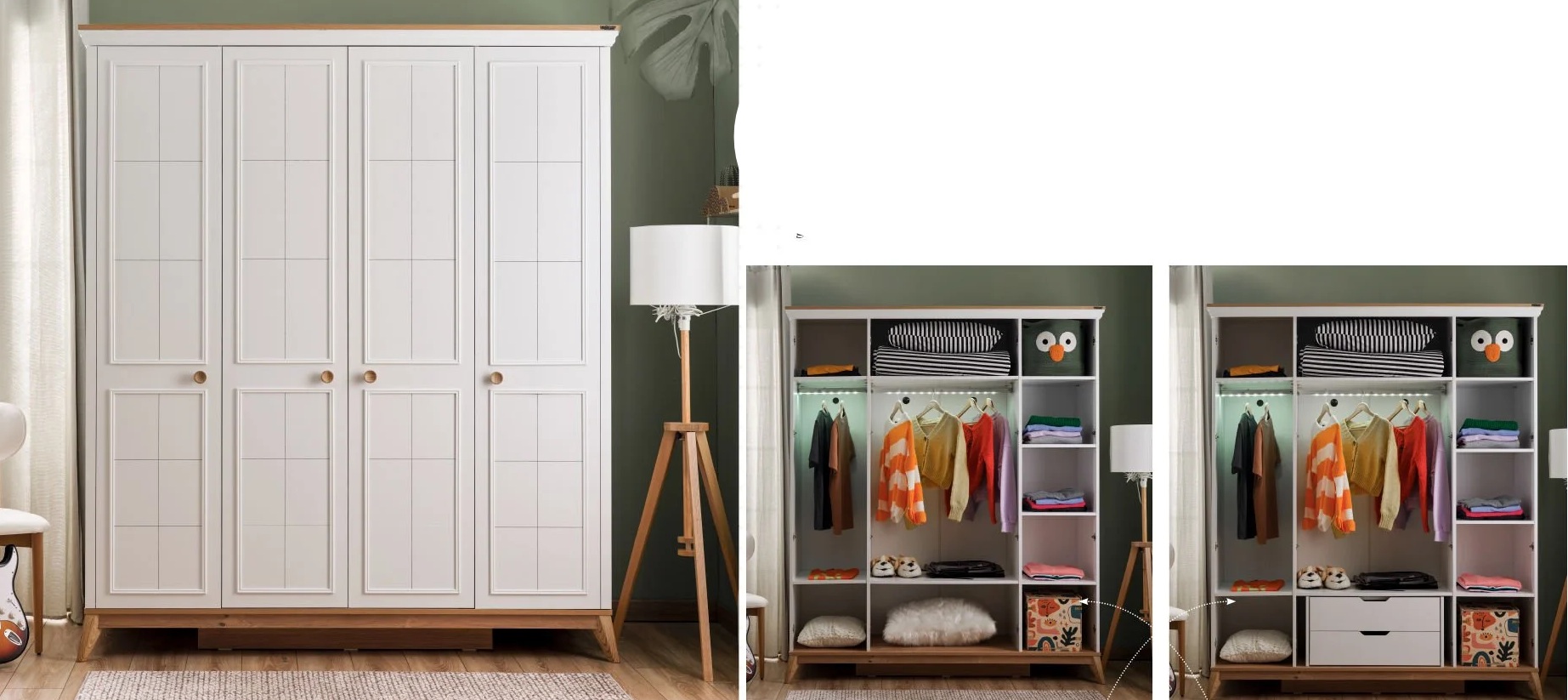 Η Τετράφυλλη Ντουλάπα Alegra διαθέτει ράγες, ράφια και συρτάρια με μηχανισμούς soft-close για αθόρυβη χρήση, και ταιριάζει σε κάθε παιδικο ή/και εφηβικό υπνοδωμάτιο. Χαρακτηριστικά: Συμπεριλαμβάνονται Η συναρμολόγηση δεν περιλαμβάνεται στην παραπάνω τιμή.