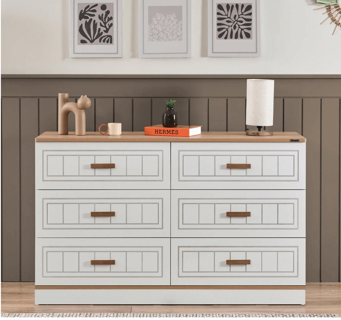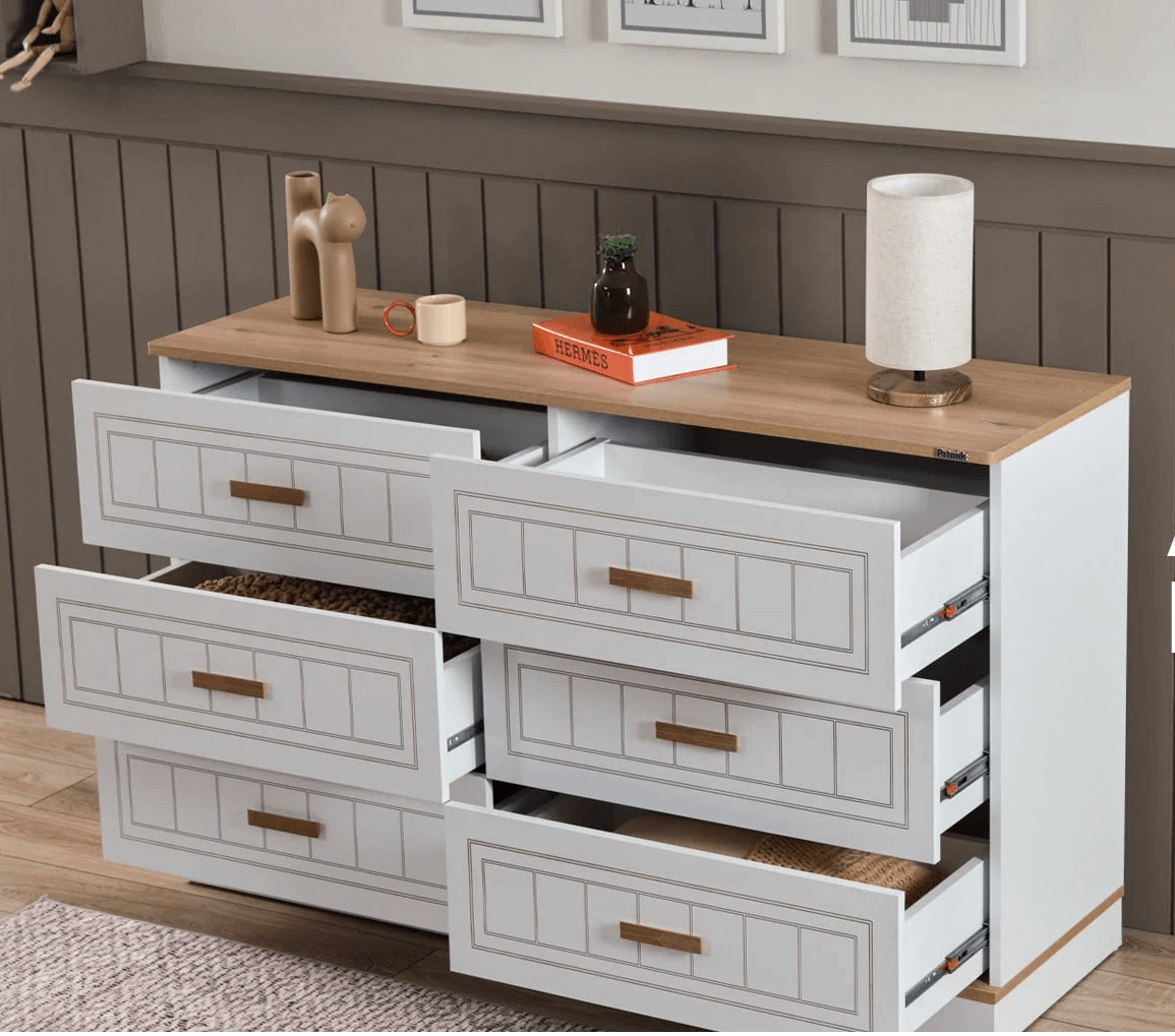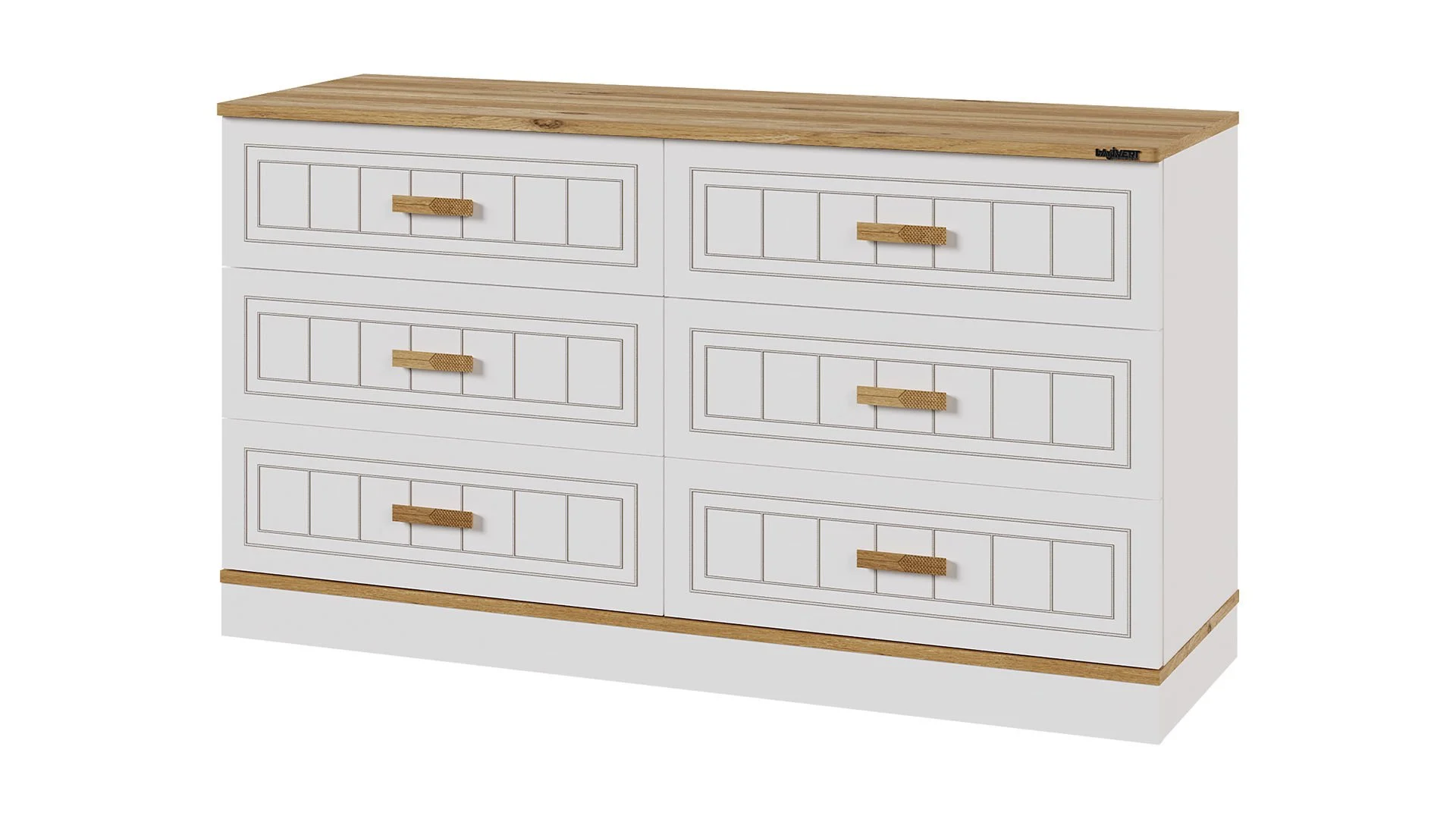 Η μεγάλη συρταριέρα Bella αποτελεί μια κομψή και λειτουργική επιλογή για την οργάνωση του χώρου σας. Διαθέτει έξι ευρύχωρα συρτάρια σε άσπρο χρώμα , που προσδίδουν μια ρομαντική και μοντέρνα πινελιά. Τα ξύλινα χερούλια ολοκληρώνουν το αισθητικό αποτέλεσμα, ενώ η στιβαρή της κατασκευή εξασφαλίζει αντοχή και μακροχρόνια χρήση. Ιδανική για υπνοδωμάτια ή χώρους με ανάγκη αποθήκευσης και στυλ. Χρησιμοποιείται μοριοσανίδα με επικάλυψη μελαμίνης, η οποία έχει υψηλή αντοχή στο νερό και την υγρασία,Δεν περιέχει καρκινογόνες ουσίες σύμφωνα με τα κριτήρια για την ανθρώπινη υγεία.