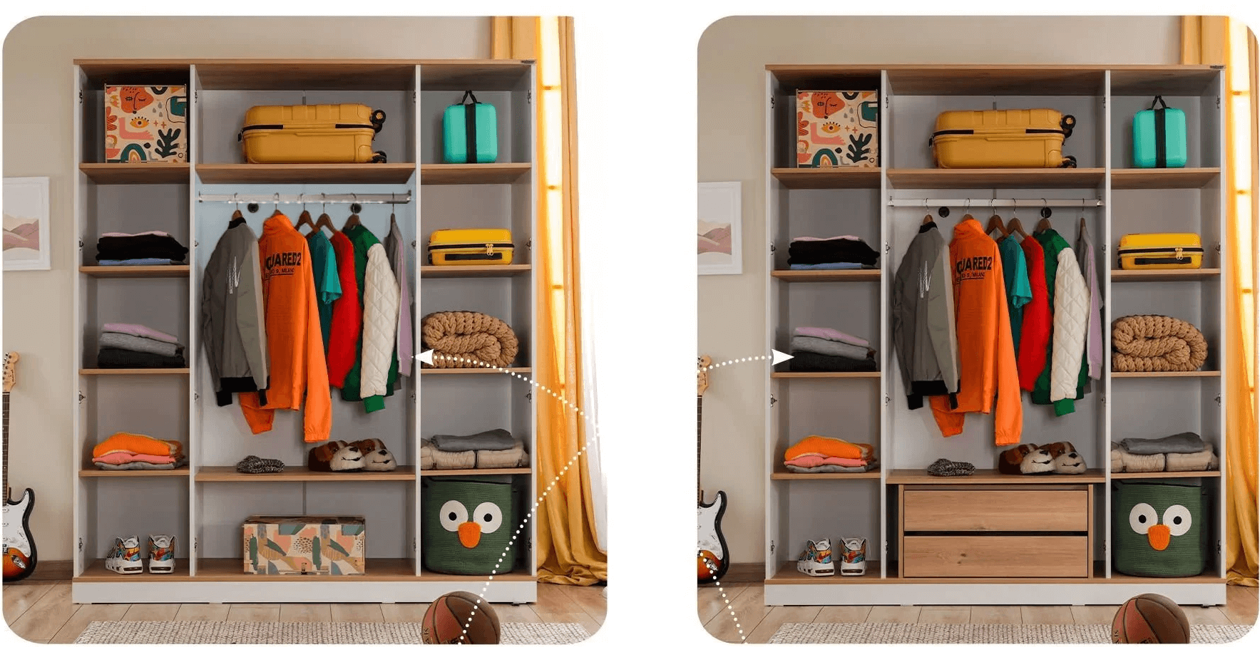 Η τετράφυλλη ντουλάπα Bella συνδυάζει λειτουργικότητα και αισθητική, ιδανική για την οργάνωση κάθε χώρου. Η ντουλάπα της φωτογραφίας είναι μια κομψή και πρακτική επιλογή για παιδικά ή εφηβικά δωμάτια, σχεδιασμένη με έμφαση στη λειτουργικότητα και το μοντέρνο στυλ. Κατασκευασμένη σε δίχρωμο συνδυασμό λευκού και κρεμ , συνδυάζει αισθητική φρεσκάδα και αρμονία, ιδανική για να ταιριάξει με κάθε διακόσμηση. Η ντουλάπα διαθέτει τέσσερα φύλλα που ανοίγουν για να αποκαλύψουν έναν ευρύχωρο εσωτερικό χώρο οργάνωσης. Περιλαμβάνει: Η στιβαρή κατασκευή και τα μοντέρνα μεταλλικά στοιχεία στις λαβές και στα πόδια προσδίδουν κομψότητα και σταθερότητα. Η ντουλάπα αποτελεί μια ολοκληρωμένη λύση αποθήκευσης, ιδανική για τη διατήρηση της τάξης και της οργάνωσης σε κάθε παιδικό δωμάτιο.