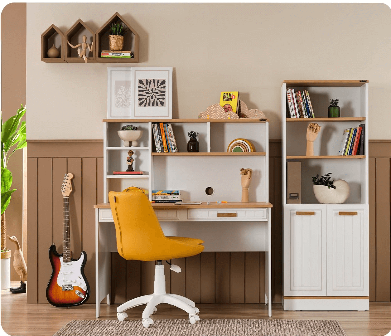 Η βιβλιοθήκη Bella έχει ένα κομψό και λειτουργικό σχέδιο, κατάλληλο για εφηβικό δωμάτιο ή μικρούς χώρους. Είναι βαμμένη σε απαλή λευκή απόχρωση και διαθέτει τρία ανοιχτά ράφια για αποθήκευση ή διακόσμηση, και ένα ντουλάπι στο κάτω μέρος για επιπλέον αποθήκευση. Οι λεπτές γραμμές και τα καμπυλωτά πλαϊνά της προσδίδουν μία κομψή και φιλική αισθητική. -Μοριοσανίδα γενικής χρήσης με επικάλυψη μελαμίνης και προφίλ mdf με επικάλυψη pvc * Μεντεσές με στοπ για ευκολία στη χρήση