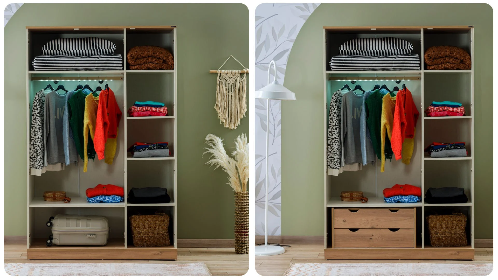 Με ευρύχωρους αποθηκευτικούς χώρους, κρεμάστρες, ράφια και δύο συρτάρια στη βάση, προσφέρει πρακτικότητα για ρούχα και αξεσουάρ.