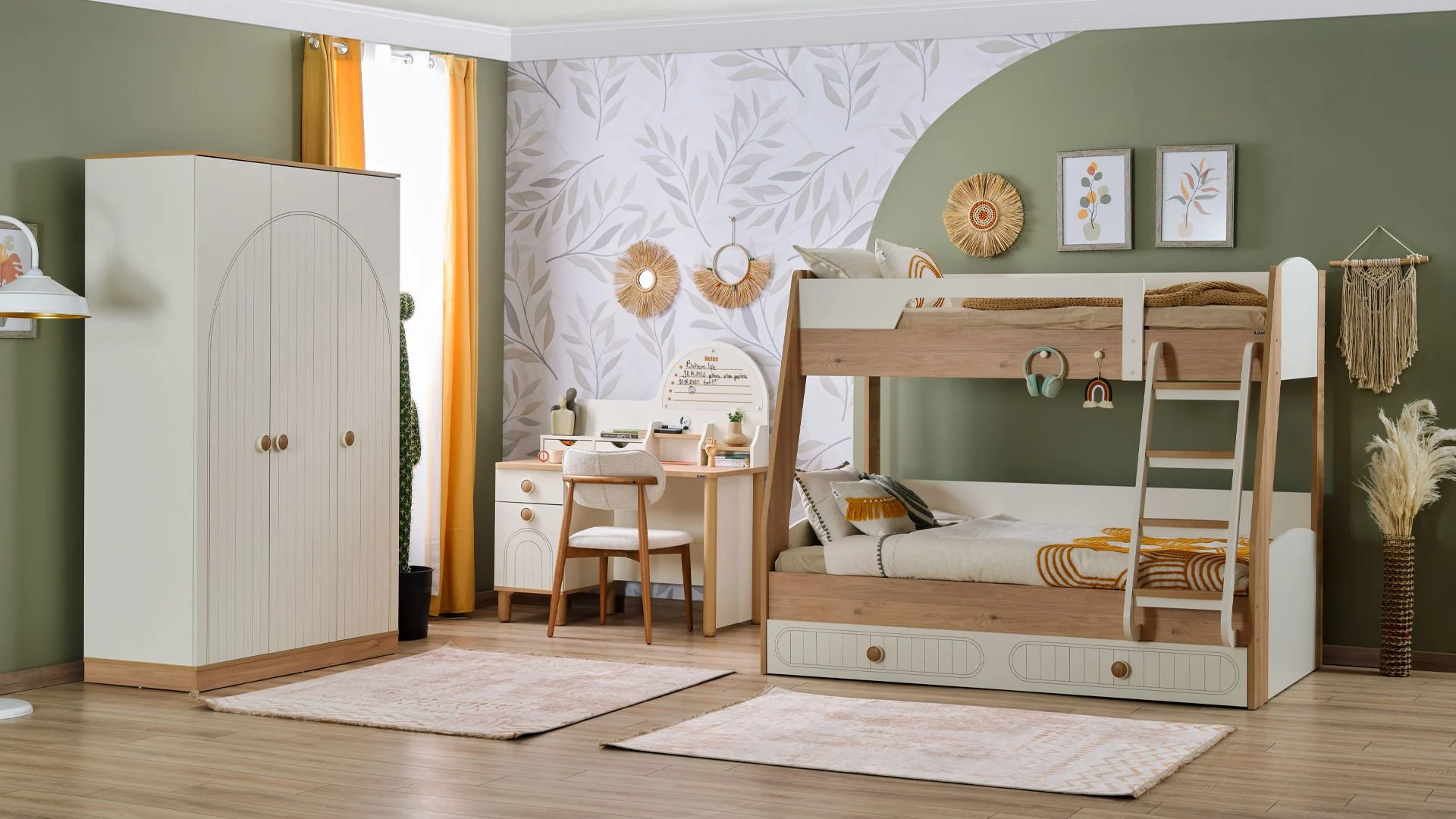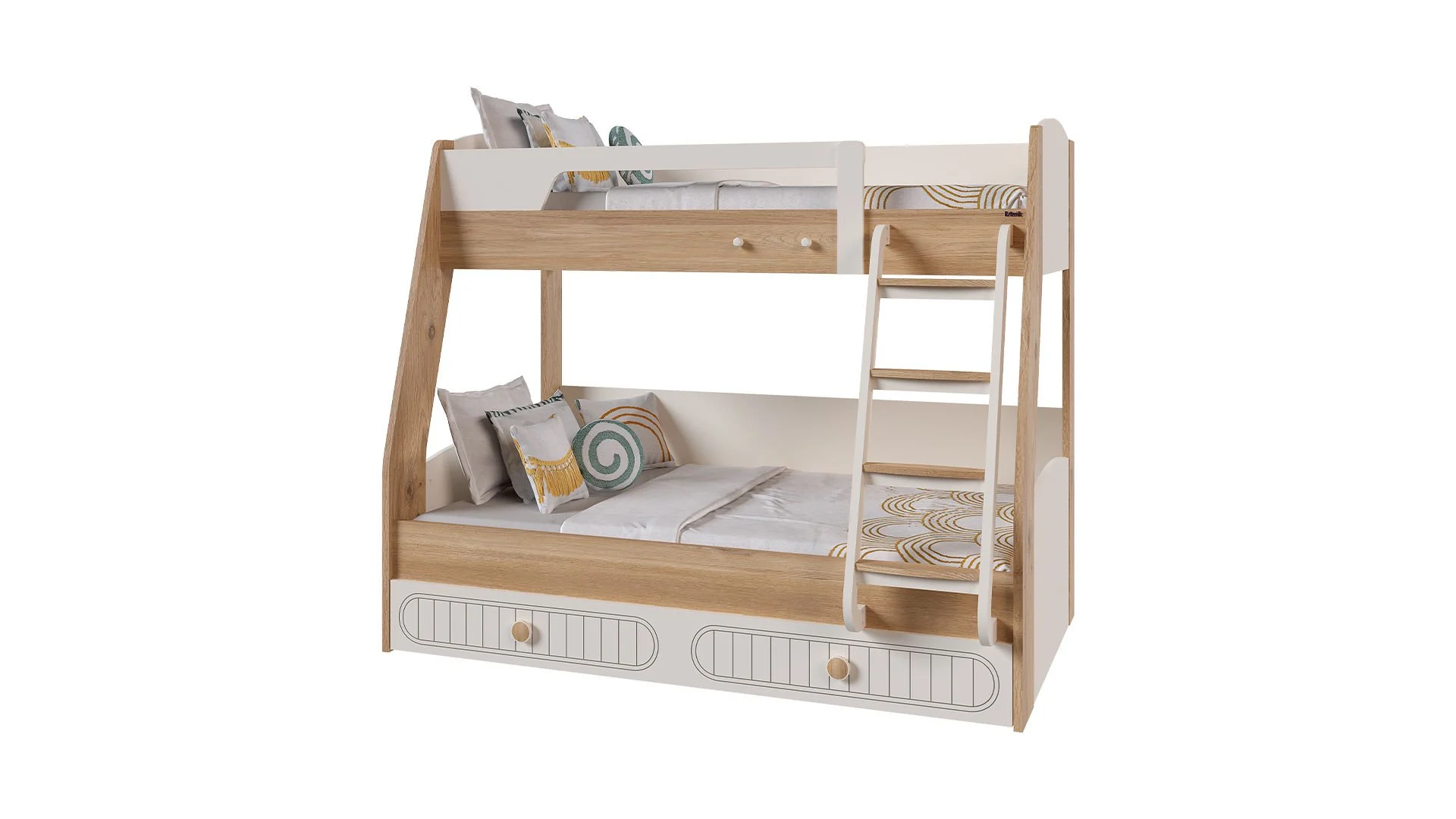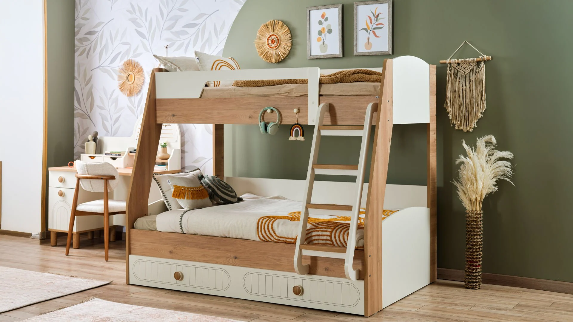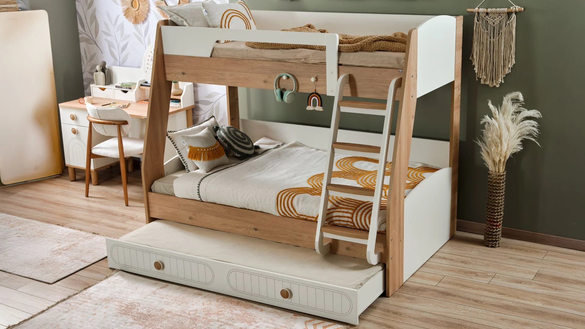 Ανακάλυψε τη μαγεία της Bohemlife ! Με πάνω κρεβάτι 90 x 200 εκ., κάτω κρεβάτι 1,20 x 200 εκ. και ένα έξυπνο συρόμενο κρεβάτι 90 x 190 εκ., όλα προσβάσιμα μέσω της στιλάτης και ασφαλούς σκάλας, το δωμάτιο γίνεται ένας χώρος για παιχνίδι, ξεκούραση και χαρούμενες στιγμές με φίλους ή αδέρφια. Ανθεκτική, πρακτική και γεμάτη στυλ – η Bohemlife μεγαλώνει μαζί με τα παιδιά! Συρόμενο κρεβάτι: 199εκ. 24 εκ. 96εκ.