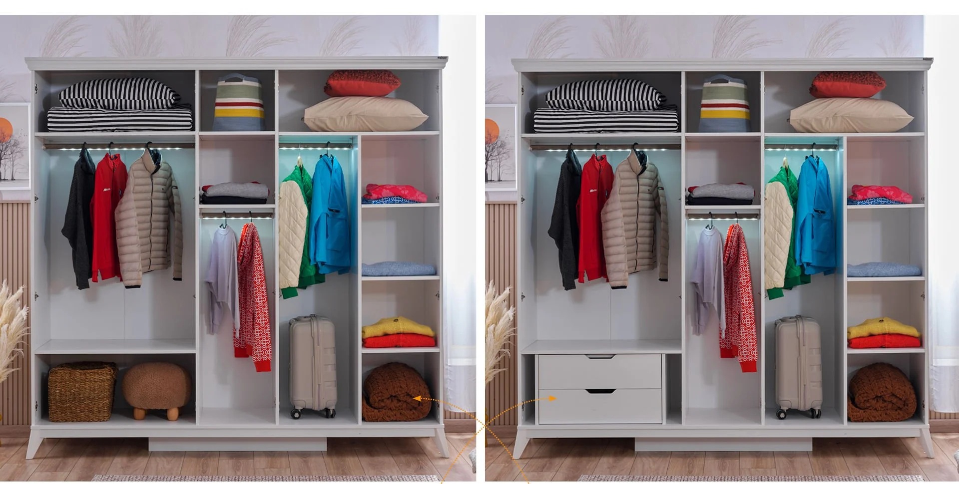 Η ντουλάπα διαθέτει τέσσερα φύλλα που ανοίγουν για να αποκαλύψουν έναν ευρύχωρο εσωτερικό χώρο οργάνωσης. Περιλαμβάνει: