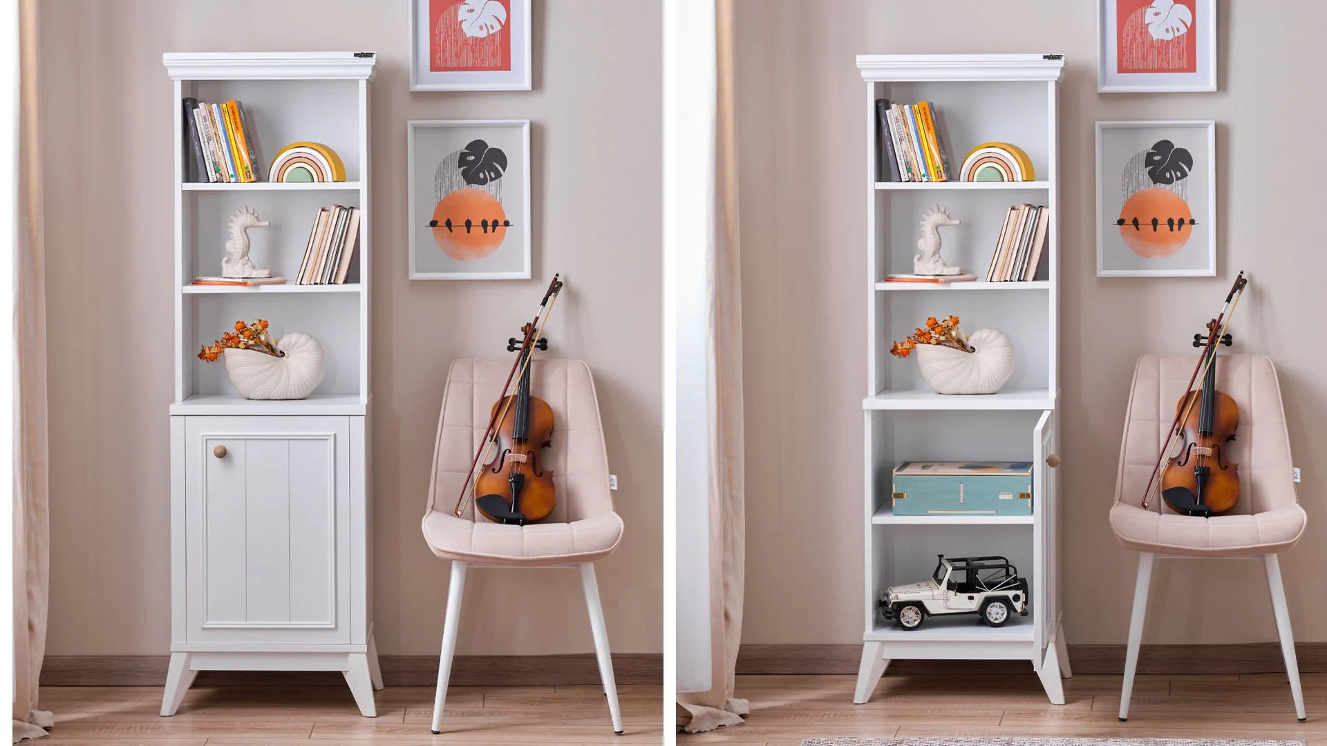 Η Βιβλιοθήκη Gloria έχει ένα κομψό και λειτουργικό σχέδιο, κατάλληλο για παιδικό δωμάτιο ή μικρούς χώρους. Διαθέτει τρία ανοιχτά ράφια για αποθήκευση ή διακόσμηση, και ένα ντουλάπι στο κάτω μέρος για επιπλέον αποθήκευση. Οι λεπτές γραμμές και τα καμπυλωτά πλαϊνά της προσδίδουν μία κομψή και φιλική αισθητική.
