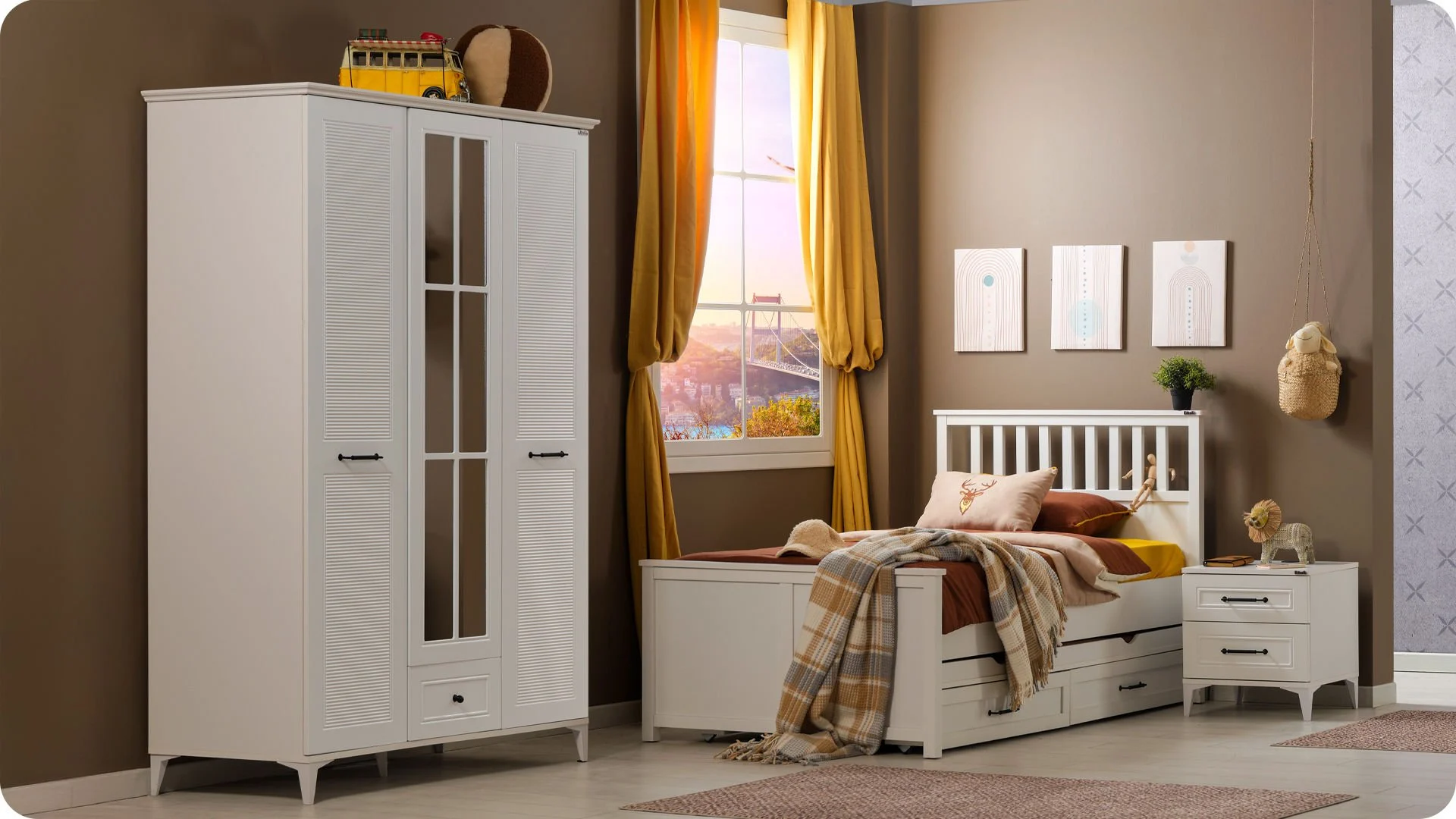 Η Τρίφυλλη Ντουλάπα Golf διαθέτει ράγες, ράφια και συρτάρια με μηχανισμούς soft-close για αθόρυβη χρήση, και ταιριάζει σε κάθε παιδικο ή/και εφηβικό υπνοδωμάτιο.
