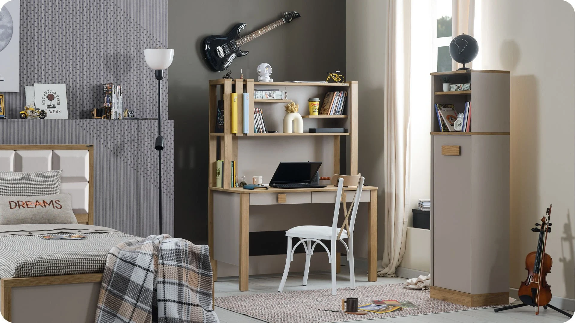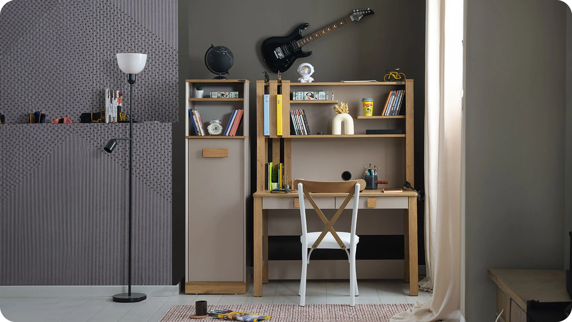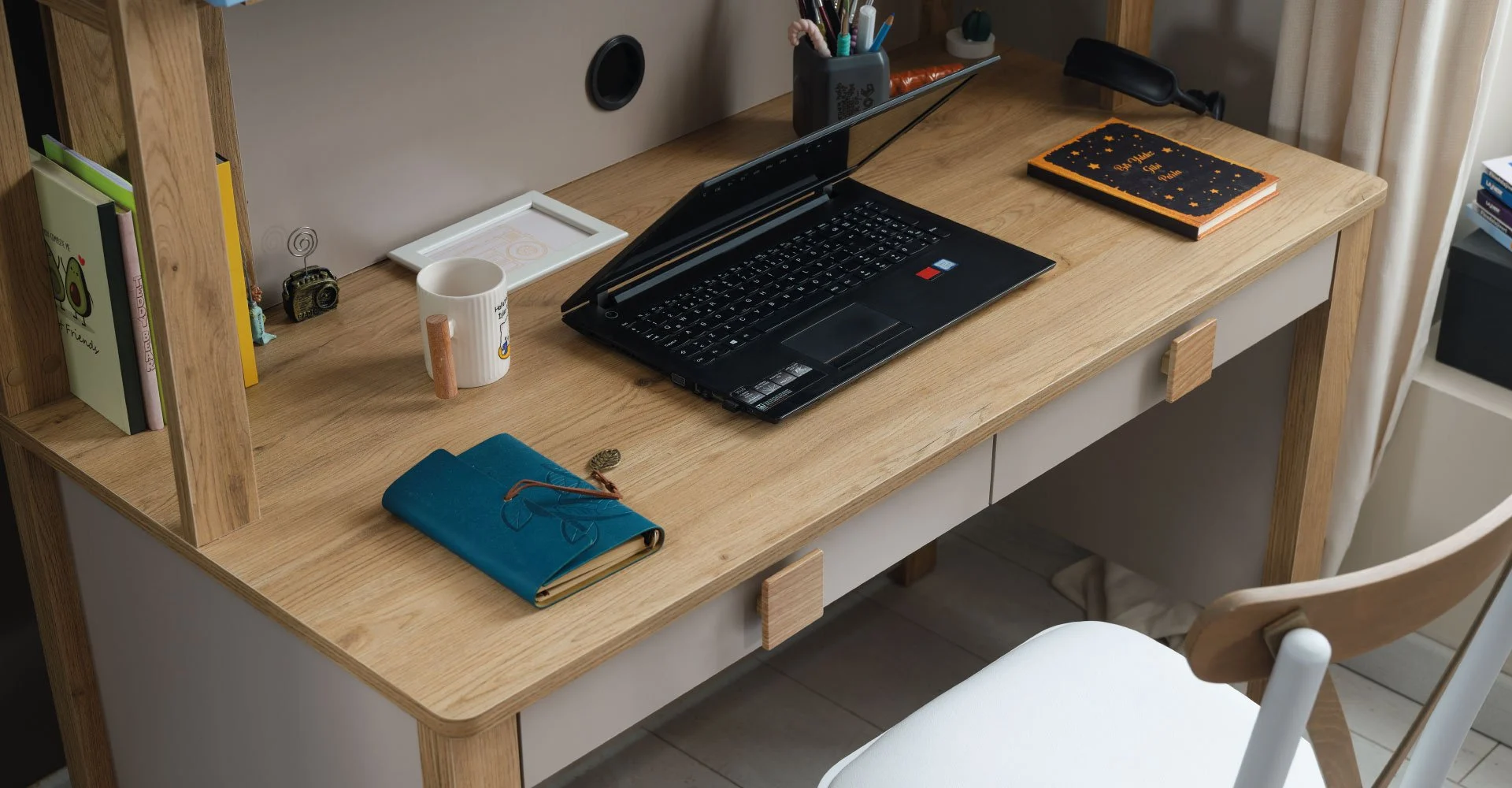 Το παιδικό γραφείο Huga συνδυάζει λειτουργικότητα και κομψότητα, ιδανικό για το παιδικό ή εφηβικό δωμάτιο. Διαθέτει πρακτική επιφάνεια εργασίας σε γήινα χρώμα, με λευκή βάση που προσδίδει μια μοντέρνα και ταυτόχρονα κλασική αισθητική.