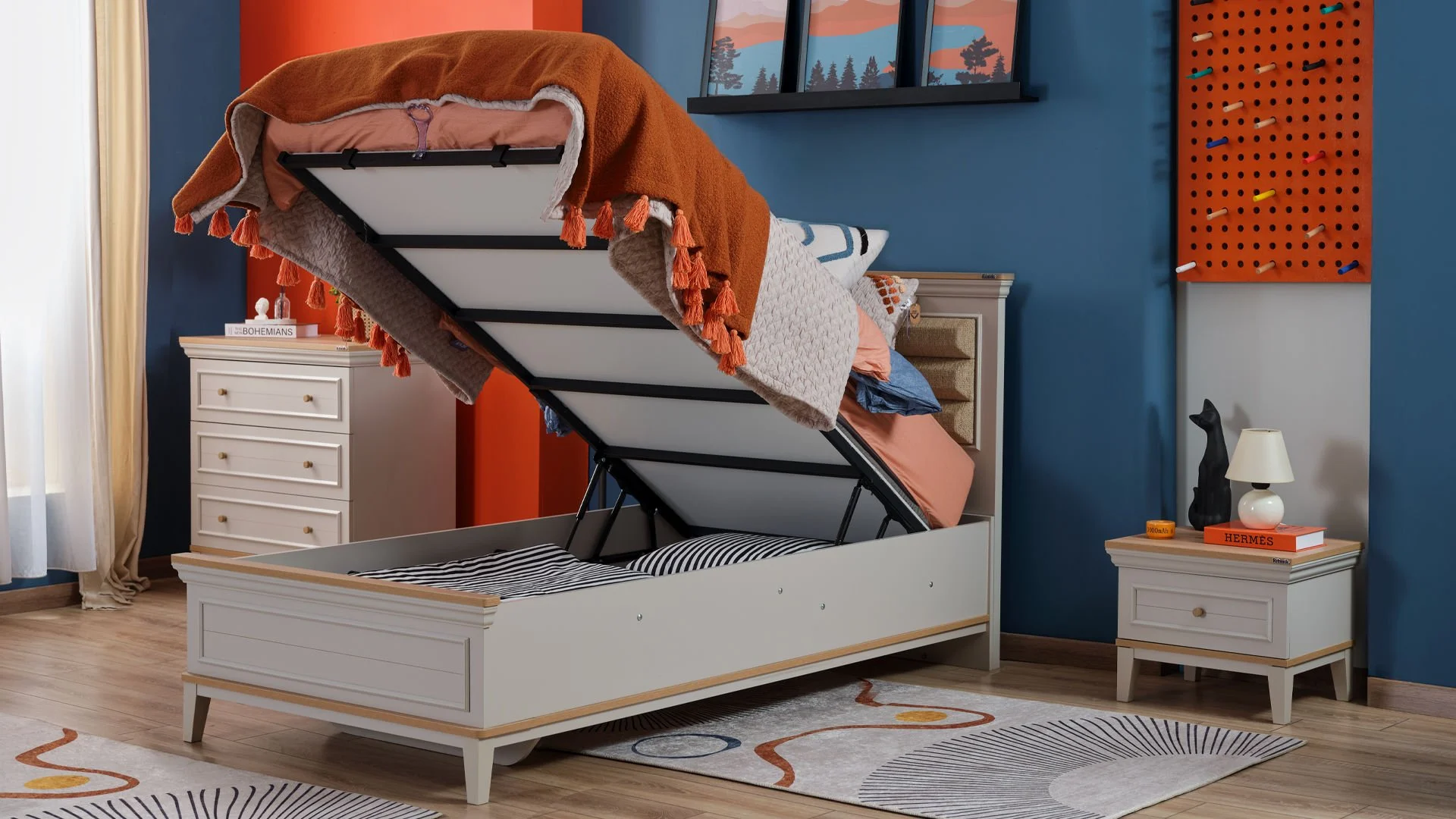 Το κρεβάτι με αποθηκευτικό χώρο Magna είναι ένα μοντέρνο, ημίδιπλο κρεβάτι με καλαίσθητο και κομψό σχεδιασμό. Το λευκό πλαίσιο και οι λεπτομέρειες ολοκληρώνουν τη minimal αισθητική του δωματίου, προσφέροντας μια φωτεινή και αρμονική εικόνα. Ιδανικό για στρώμα διαστάσεων 100 x 200 εκ. και 120 x 200 εκ. , το κρεβάτι είναι κατάλληλο για ένα παιδικό ή εφηβικό δωμάτιο, συνδυάζοντας λειτουργικότητα και στυλ.