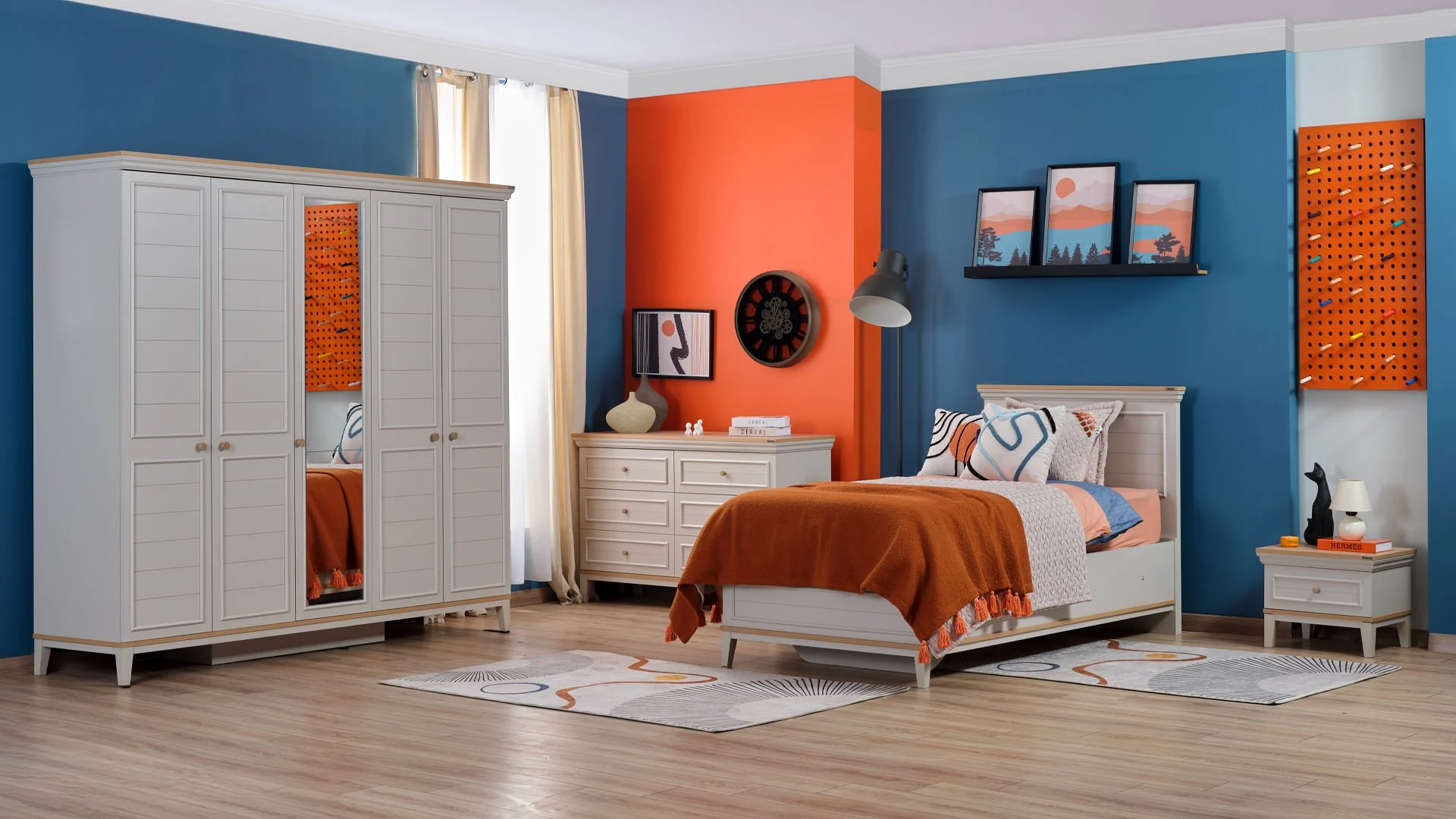 Η στιβαρή κατασκευή και τα μοντέρνα μεταλλικά στοιχεία στις λαβές και στα πόδια προσδίδουν κομψότητα και σταθερότητα. Η ντουλάπα αποτελεί μια ολοκληρωμένη λύση αποθήκευσης, ιδανική για τη διατήρηση της τάξης και της οργάνωσης σε κάθε παιδικό δωμάτιο.