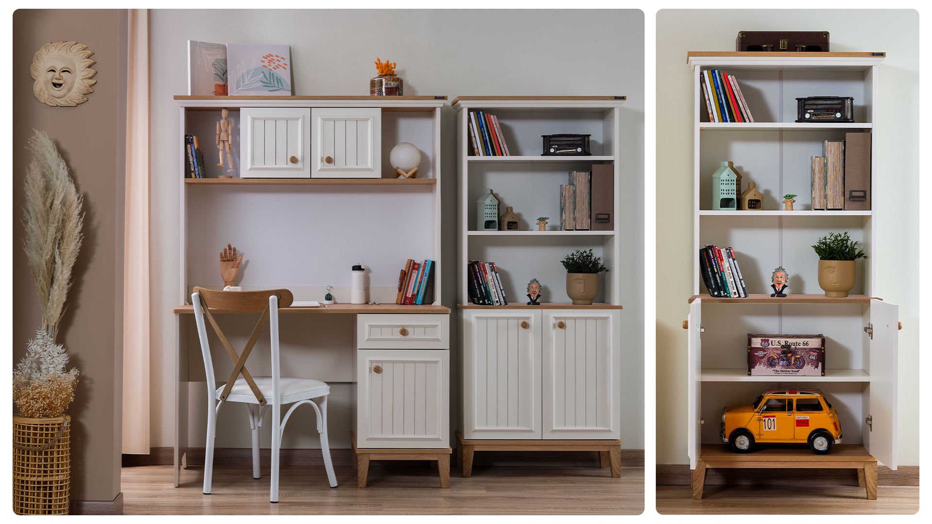 Είναι βαμμένη σε απαλή λευκή απόχρωση και διαθέτει τρία ανοιχτά ράφια για αποθήκευση ή διακόσμηση, και ένα ντουλάπι στο κάτω μέρος για επιπλέον αποθήκευση.