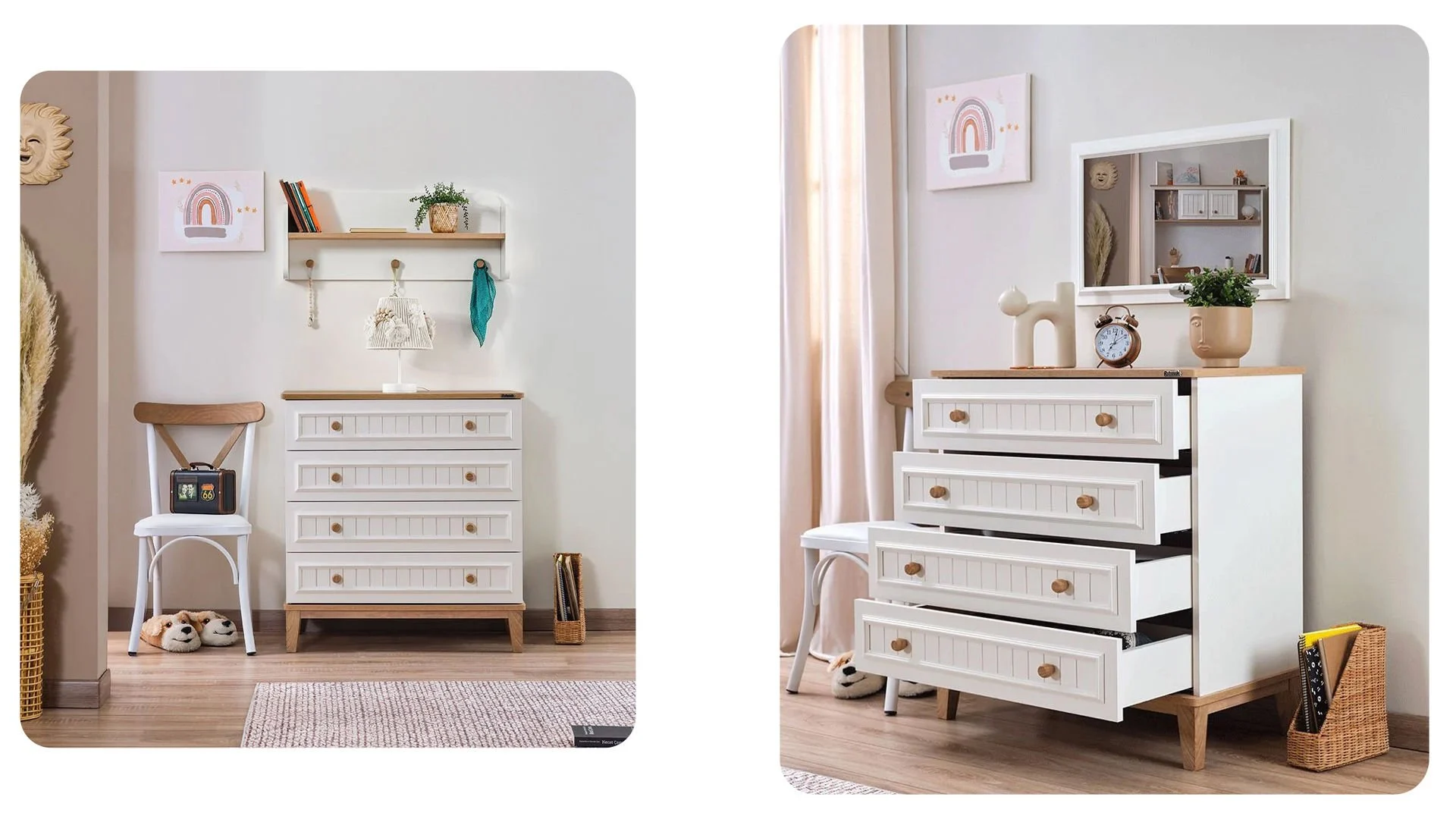 Διαθέτει τέσσερα ευρύχωρα συρτάρια σε άσπρο χρώμα, που προσδίδουν μια ρομαντική και μοντέρνα πινελιά.