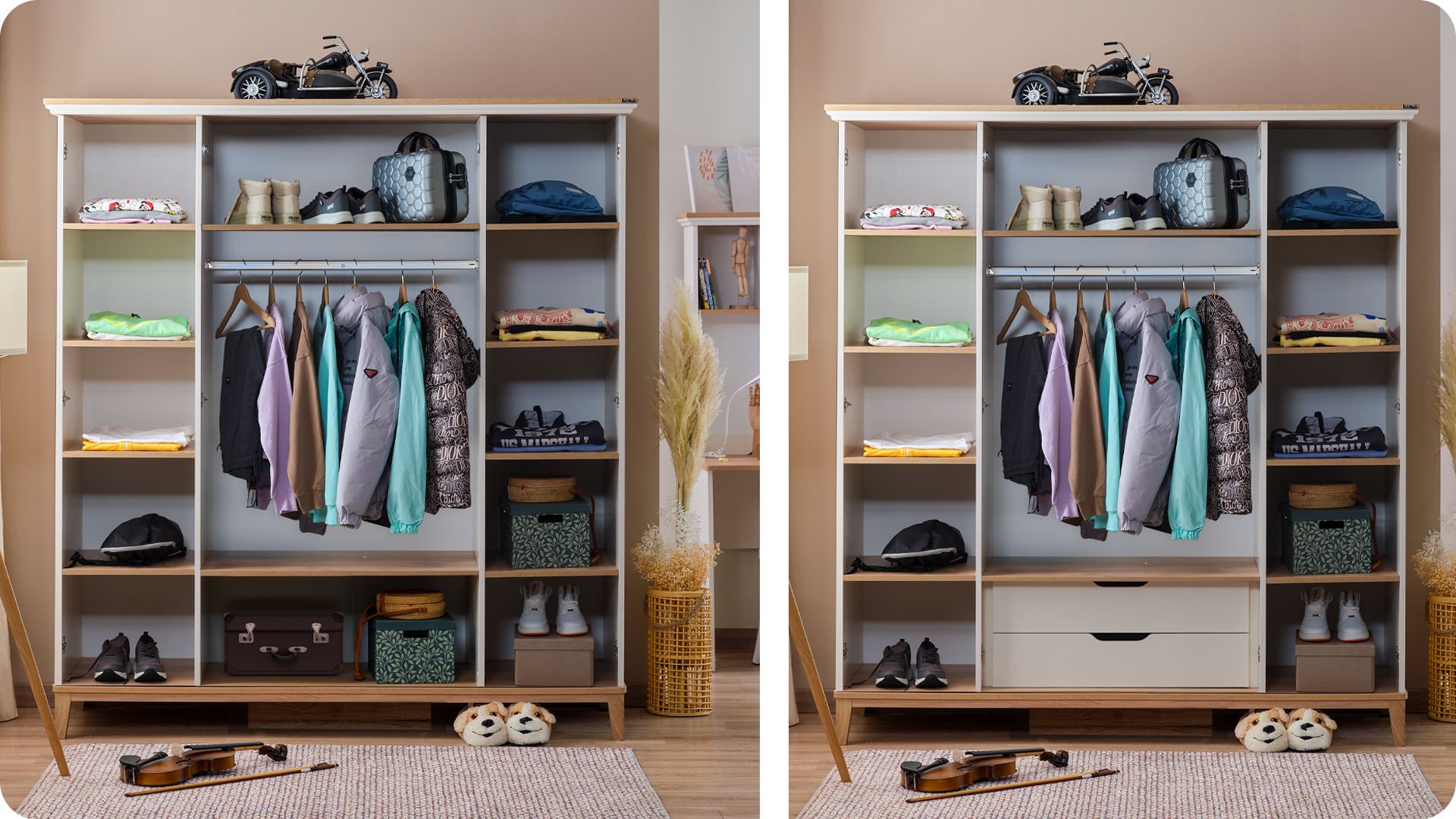 Η ντουλάπα διαθέτει τέσσερα φύλλα που ανοίγουν για να αποκαλύψουν έναν ευρύχωρο εσωτερικό χώρο οργάνωσης. Περιλαμβάνει: