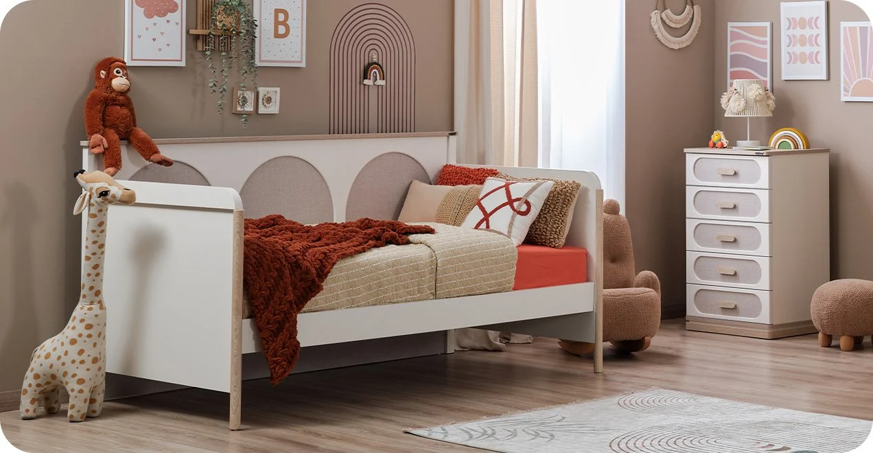 Μπορείτε να επιλέξετε και το επιπλεόν συρόμενο κρεββάτι με αποθηκευτικό χώρο για περισσότερη εργονομία και λύσεις Πλάτος Υψος Βάθος Μοντεσσόρι 210 εκ. 106 εκ. 100εκ. Κάτω κρεβάτι 199εκ. 100εκ. 28εκ. * Μοριοσανίδα γενικής χρήσης με επικάλυψη μελαμίνης * Επίστρωση μεμβράνης στο πίσω πάνελ MDF σε μποέμικο στυλ * Σχεδιασμένα ξύλινα πόδια για αυξημένη ανθεκτικότητα * Στρογγυλεμένες μαλακές γωνίες για προστασία από χτυπήματα και τραυματισμούς * Ράγες συρταριών με κρυφά φρένα * Λαβή με ξύλινη εμφάνιση που ταιριάζει με το σετ * Δυνατότητα μετακίνησης στην επιθυμητή θέση χάρη στο χαρακτηριστικό του κάτω τροχού * Δύο συρτάρια με μεγάλο εσωτερικό όγκο που λειτουργούν ανεξάρτητα το ένα από το άλλο και παρέχουν επιπλέον αποθηκευτικό χώρο * Μέρος κρεβατιού που μπορείτε να χρησιμοποιήσετε ως κρεβάτι φίλου εκτός από το υποπόδιο