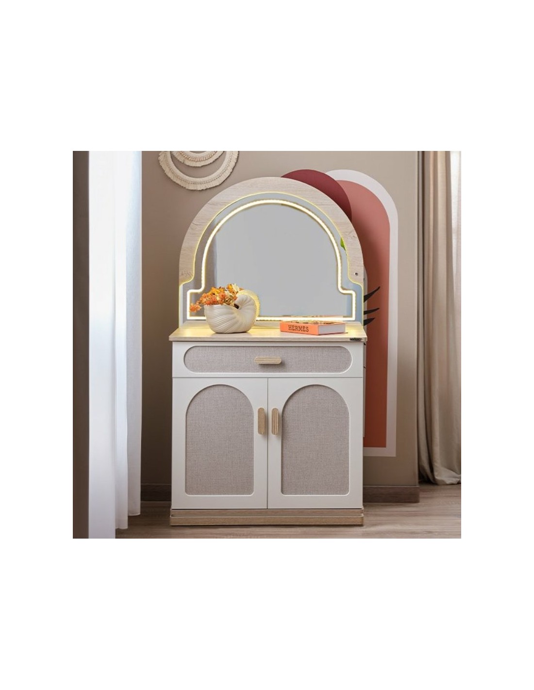 Με δύο ευρύχωρα ντουλάπια για αποθήκευση ρούχων, αξεσουάρ ή άλλων αντικειμένων, ένα μεγάλο συρτάρι καθώς και έναν πρακτικό καθρέπτη στην επάνω επιφάνεια κατόπιν επιλογής.