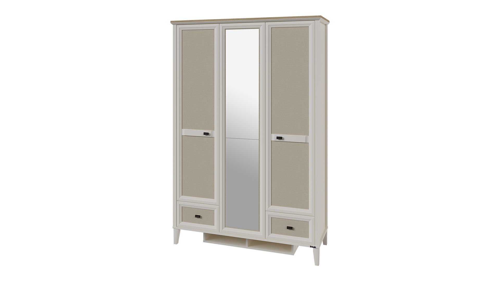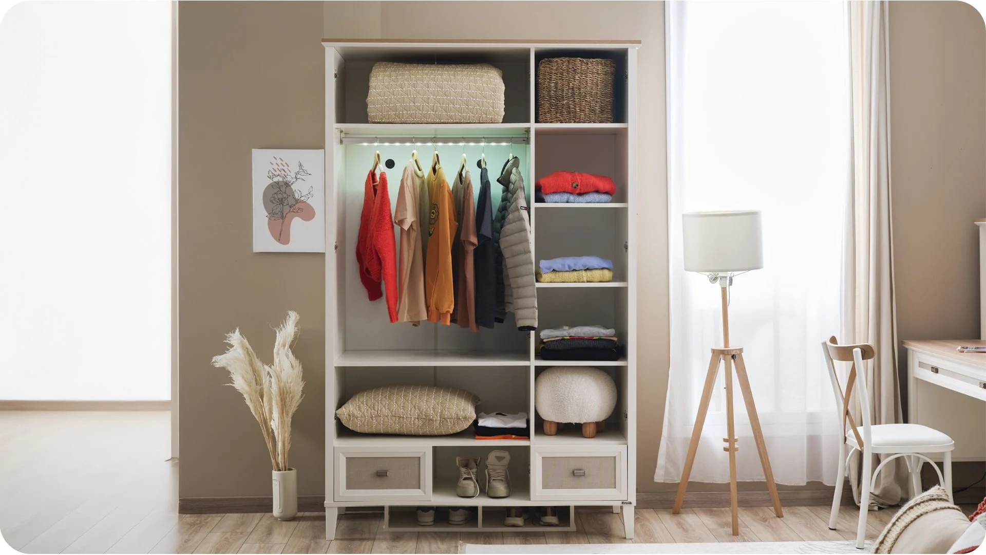 Η ντουλάπα διαθέτει τρία φύλλα που ανοίγουν για να αποκαλύψουν έναν ευρύχωρο εσωτερικό χώρο οργάνωσης. Περιλαμβάνει: