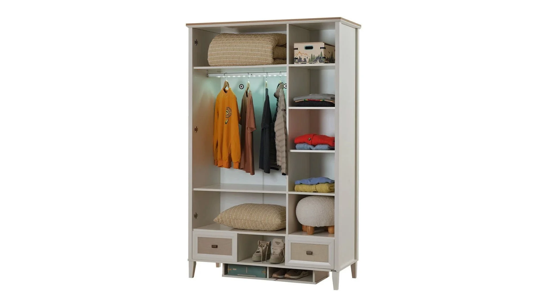 Η στιβαρή κατασκευή και τα μοντέρνα μεταλλικά στοιχεία στις λαβές και στα πόδια προσδίδουν κομψότητα και σταθερότητα. Η ντουλάπα αποτελεί μια ολοκληρωμένη λύση αποθήκευσης, ιδανική για τη διατήρηση της τάξης και της οργάνωσης σε κάθε παιδικό δωμάτιο.