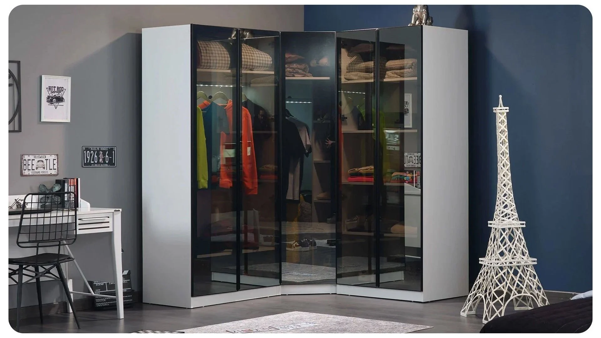 H Μονόφυλλη ντουλάπα με γυάλινη πόρτα Twin είναι αρκετά μεγάλη για να καλύψει τις ανάγκες του νέου και να έχει όλα του τα ρούχα πάντα τακτοποιημένα. Χαρακτηριστικά & Προνόμια Συμπεριλαμβάνονται