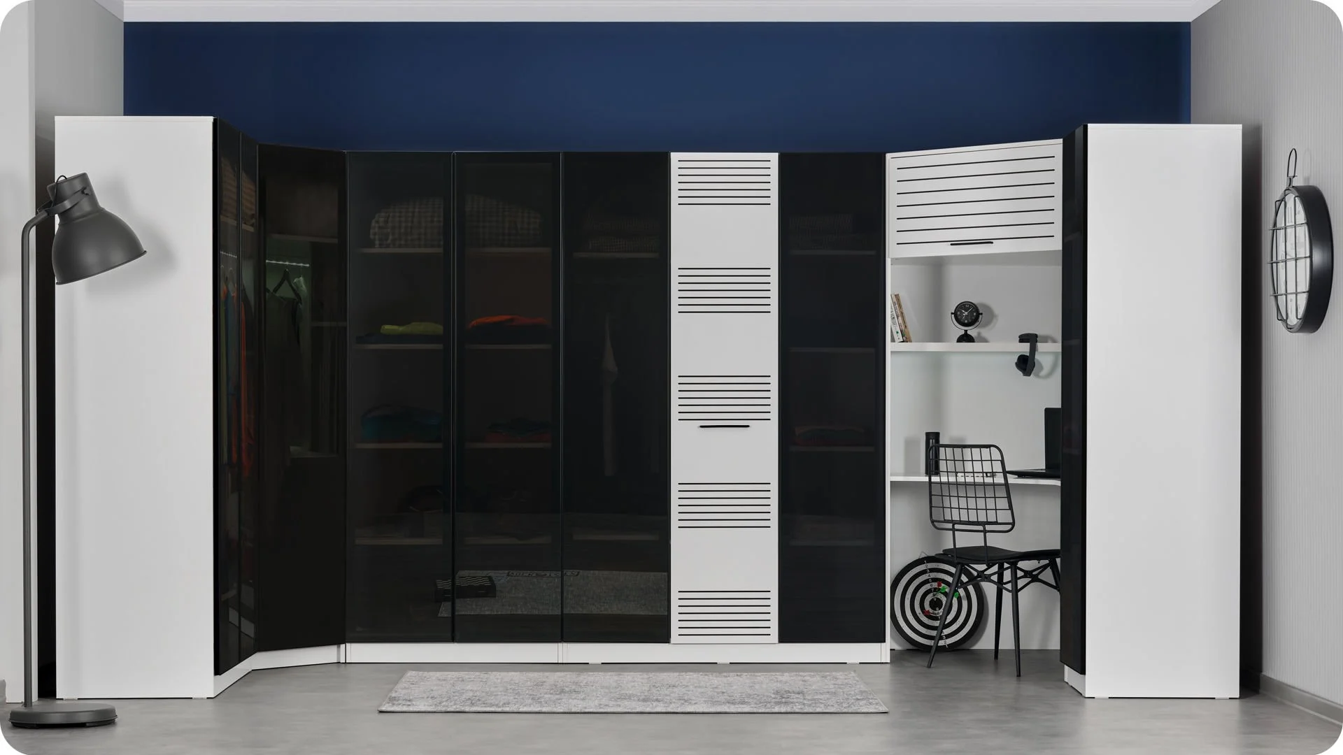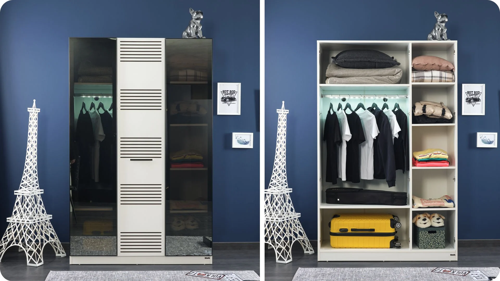 Με ευρύχωρους αποθηκευτικούς χώρους, κρεμάστρες, ράφια και δύο συρτάρια στη βάση, προσφέρει πρακτικότητα για ρούχα και αξεσουάρ.