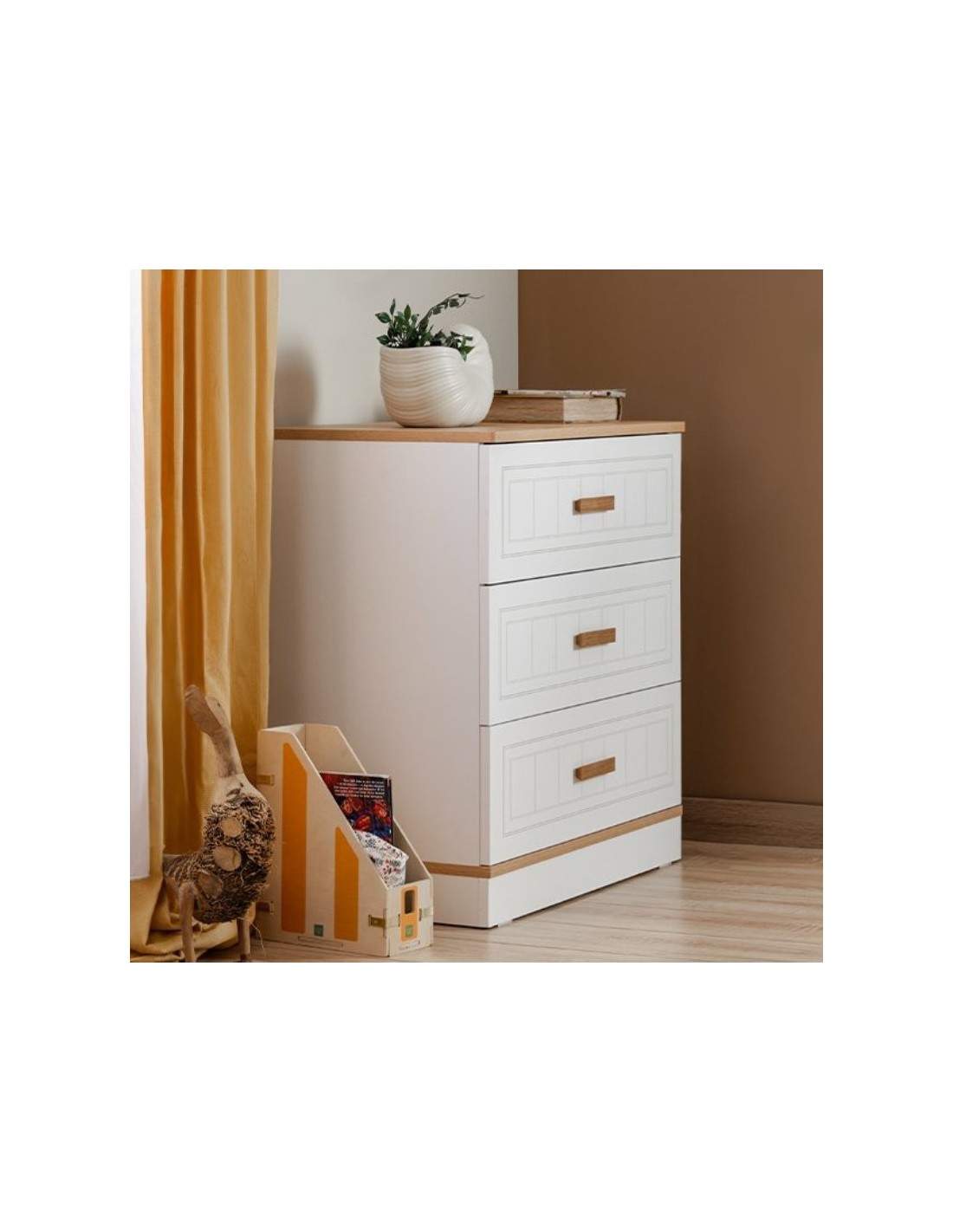 Κομψή και λειτουργική συρταριέρα που συνδυάζει πρακτικότητα και αισθητική. Με minimal σχεδιασμό σε λευκό με λεπτομέρειες φυσικού ξύλου, ταιριάζει εύκολα σε κάθε παιδικό, νεανικό ή μοντέρνο υπνοδωμάτιο. Κατασκευάζεται από μοριοσανίδα με επένδυση μελαμίνης, ανθεκτική στο νερό και την υγρασία. Δεν περιέχει καρκινογόνες ουσίες και πληροί τα κριτήρια ασφάλειας για την ανθρώπινη υγεία. Χαρακτηριστικά προϊόντος: Μοριοσανίδα γενικής χρήσης με επένδυση μελαμίνης Συρταρομηχανισμοί τηλεσκοπικοί, διπλής ανοίγματος για άνετη χρήση Χερούλια σε ξύλινη όψη, ταιριαστά με το σετ Πρόσοψη συρταριών με χάραξη λέιζερ για μοντέρνο design Στρογγυλεμένες, μαλακές γωνίες για προστασία από χτυπήματα και τραυματισμούς Διαθέτει σύστημα στήριξης στον τοίχο για ασφάλεια σε περίπτωση σεισμού και προστασία των παιδιών Ευρύχωρα συρτάρια για οργανωμένη αποθήκευση ρούχων, λευκών ειδών ή προσωπικών αντικειμένων Στιβαρή και ανθεκτική κατασκευή για πολλά χρόνια χρήσης Extra από τη φωτογραφία: Άνω επιφάνεια με υφή φυσικού ξύλου, ιδανική για διακοσμητικά, φωτιστικό ή βιβλία Καθαρός, εργονομικός σχεδιασμός που προσφέρει άνεση και πρακτικότητα Σύστημα αθόρυβης κύλισης για ήσυχη χρήση, ιδανικό για παιδικά δωμάτια H συρταριέρα παραδίδεται αμποντάριστη σε κουτιά και περιλαμβάνονται αναλυτικές οδηγίες συναρμολόγησης. Στην αναγραφόμενη τιμή δεν περιλαμβάνεται η συναρμολόγηση.