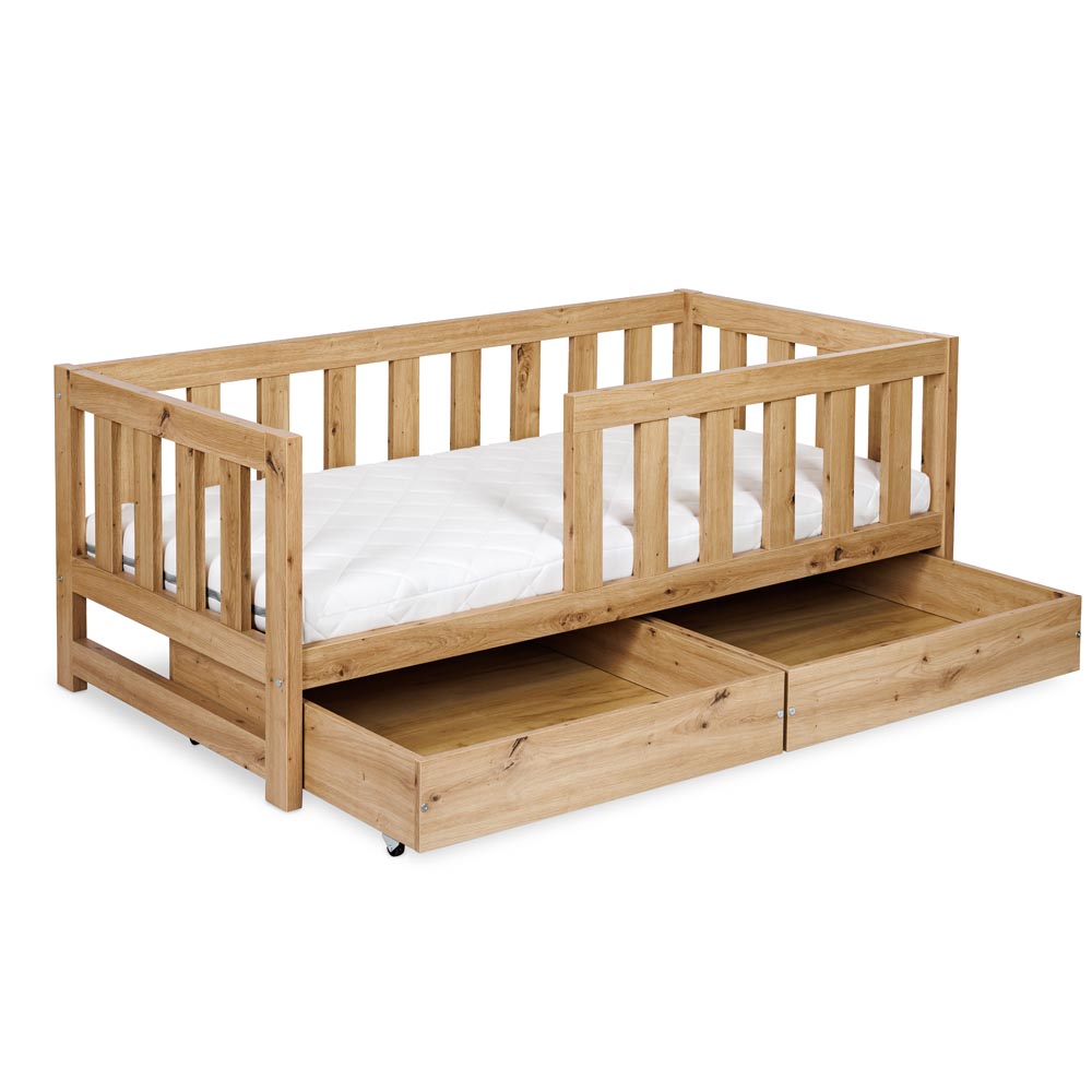 Παιδικό Κρεβάτι 160×80 με Προστατευτικά Κάγκελα – Dab / Oak. Ένα κομψό και ασφαλές κρεβάτι σχεδιασμένο ειδικά για παιδιά, με μοντέρνα γραμμή και λειτουργικότητα. Κατασκευασμένο από ανθεκτική MDF και επένδυση μελαμίνης, το κρεβάτι διατίθεται σε dab / oak χρώμα, προσφέροντας μια διαχρονική αισθητική που ταιριάζει εύκολα σε κάθε παιδικό δωμάτιο. Διαστάσεις κρεβατιού: 167 × 65 × 88 εκ. Το κρεβάτι διαθέτει προστατευτικά κάγκελα για απόλυτη ασφάλεια κατά τη διάρκεια του ύπνου, ιδανική για παιδιά που μεταβαίνουν από την κούνια στο “μεγάλο” τους κρεβάτι. Παραδίδεται αμοντάριστο, σε εργοστασιακή συσκευασία και με αναλυτικές οδηγίες συναρμολόγησης. Υπάρχει δυνατότητα συναρμολόγησης με επιπλέον κόστος.